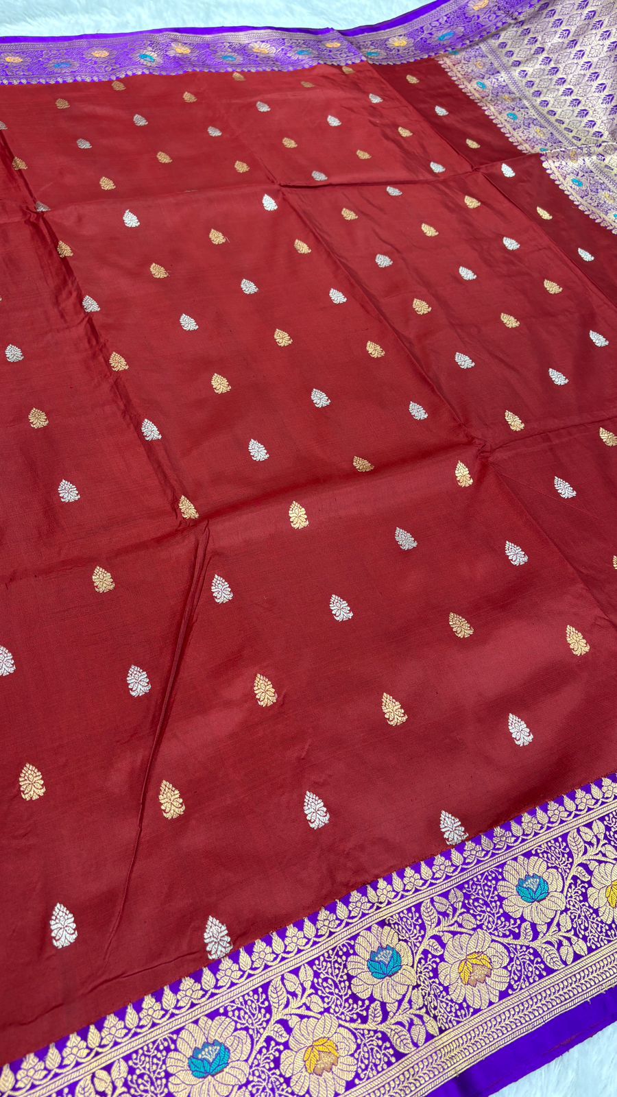 Regal Maroon & Purple Katan Kadhua Designer Silk Banarasi Saree with Sona-Chandi Boota & Meenakari