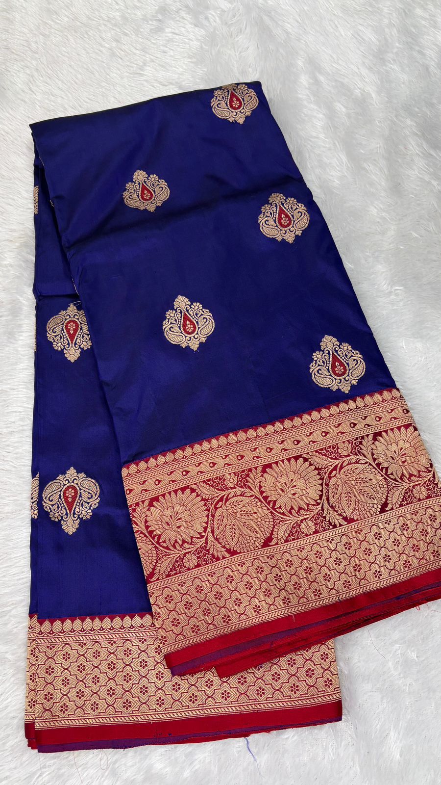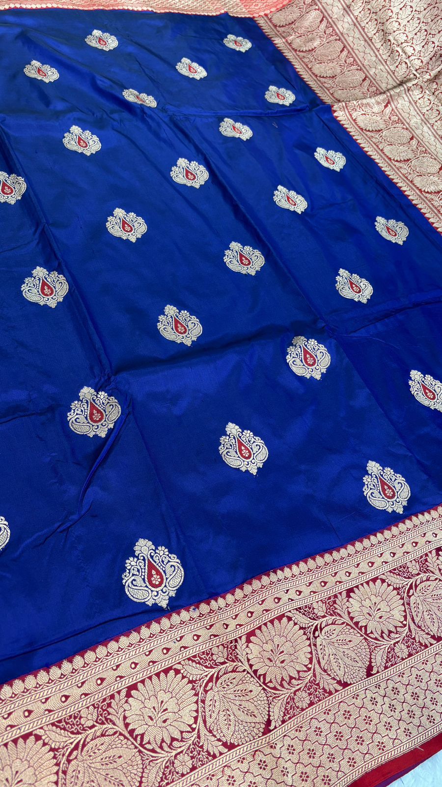 Majestic Royal Blue & Red Katan Kadhua Designer Silk Banarasi Saree with Silver Zari Paisley Buta