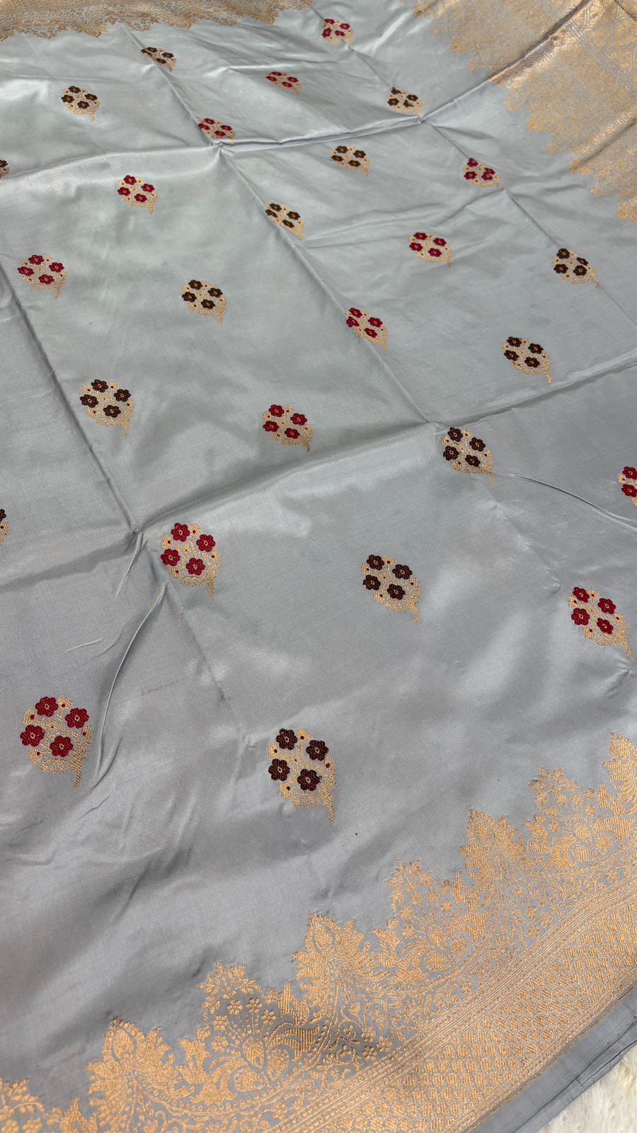 Sophisticated Grey Katan Kadhua Designer Silk Banarasi Handloom Saree with Meenakari Floral Buta