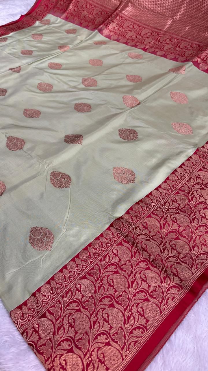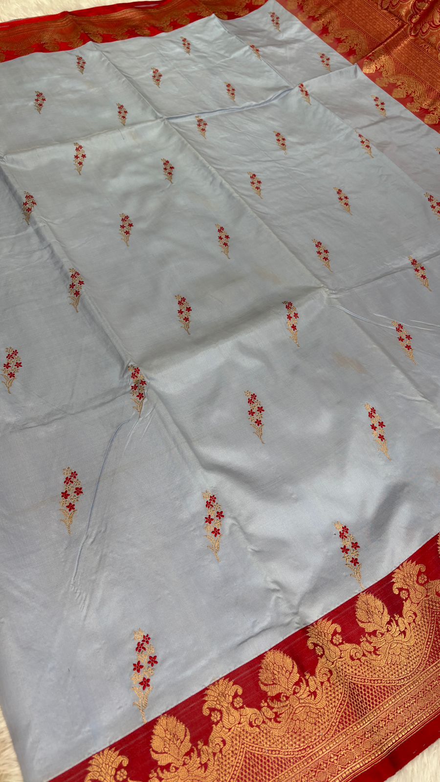 Ethereal Silver Grey Katan Kadhua Designer Silk Banarasi Saree with Contrast Red Border
