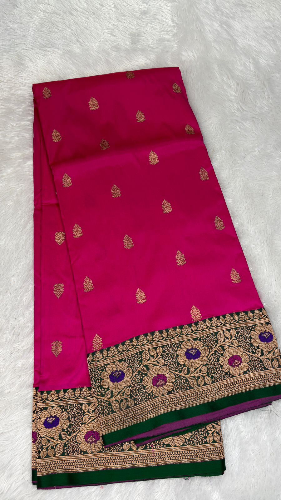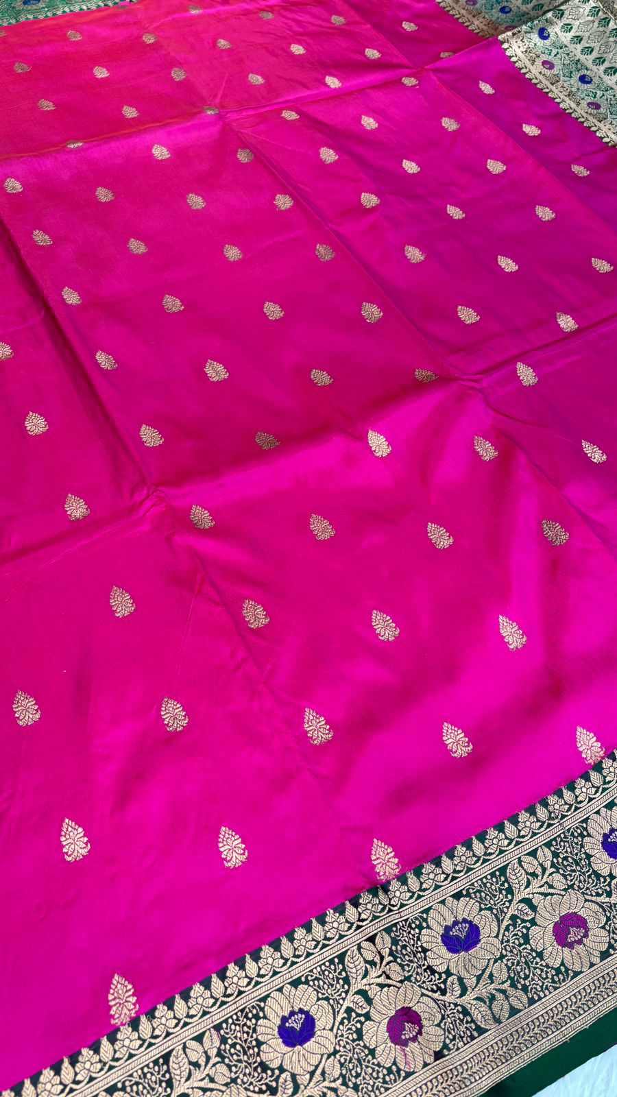 Radiant Hot Pink & Bottle Green Katan Kadhua Designer Silk Banarasi Saree with Meenakari Border