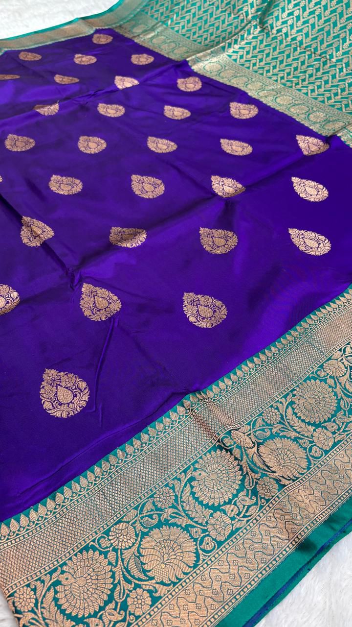 Majestic Deep Violet & Emerald Green Katan kadhua Designer Silk Banarasi Saree with Kadhua Boota