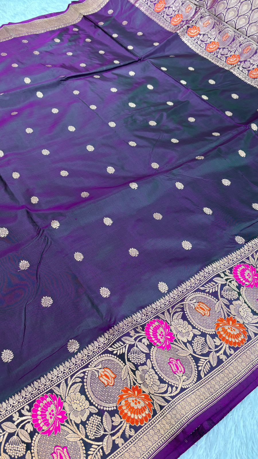 Majestic Deep Purple Katan kadhua Designer Silk Banarasi Saree with Meenakari Floral Border