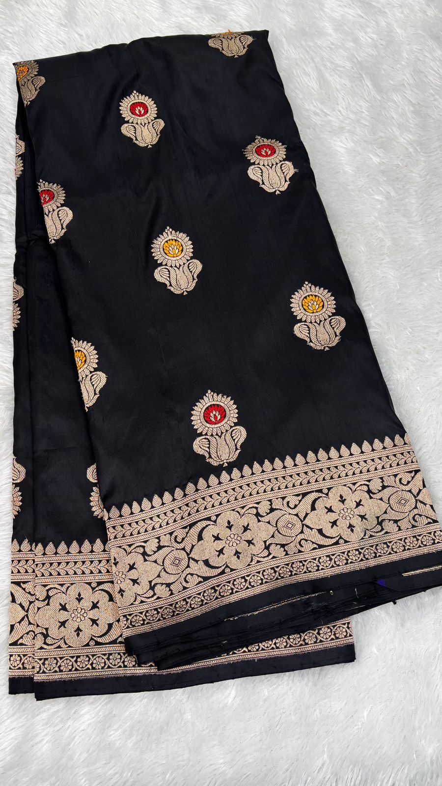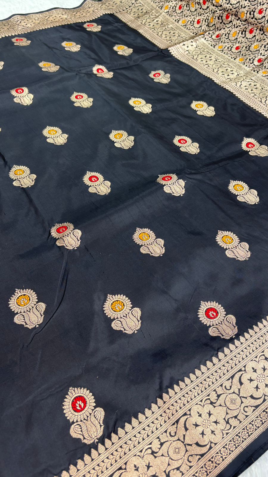 Exquisite Midnight Black Katan kadhua Designer Silk Banarasi Saree with Meenakari Kadhua Boota