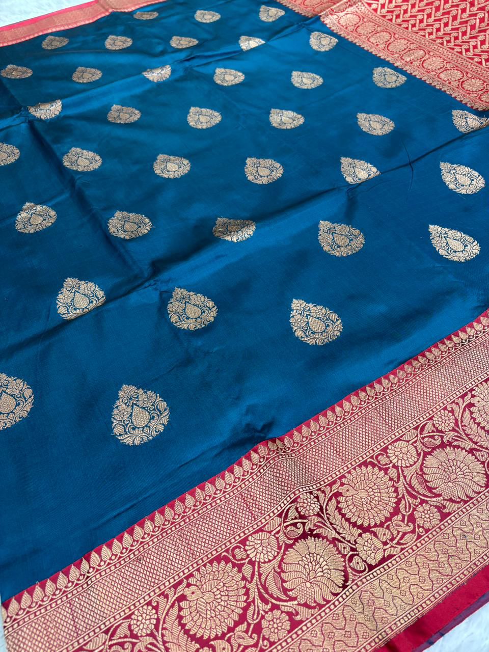 Regal Petrol Blue & Red Katan Kadhua Designer Silk Banarasi Saree with Kadhua Paisley Boota