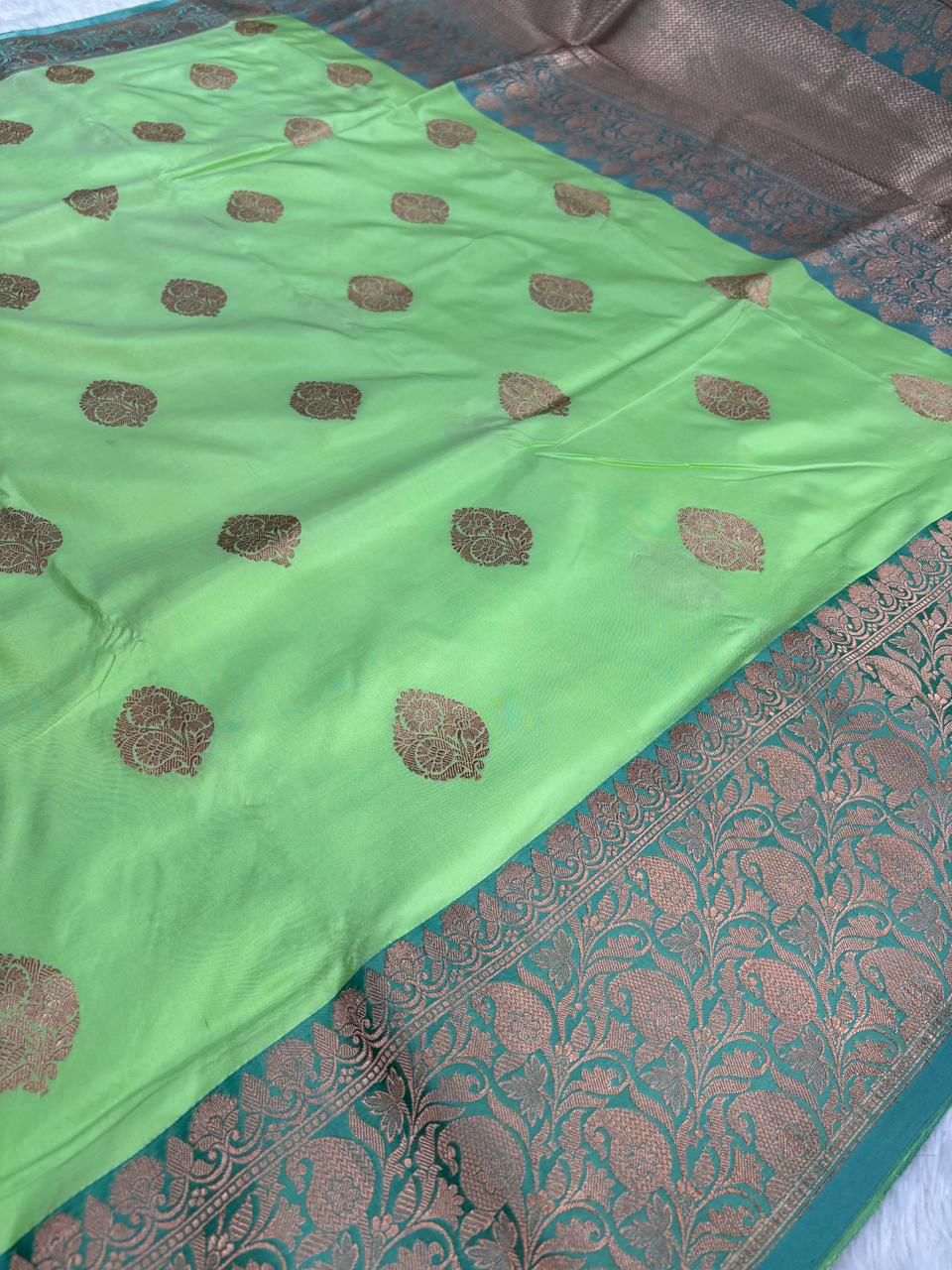 Radiant Parrot Green & Teal Blue Katan Kadhua Designer Silk Banarasi Saree with Kadhua Paisley Boota