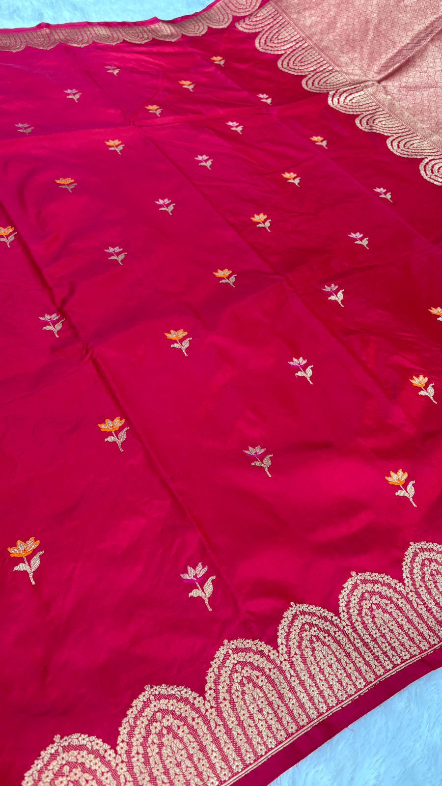 Exquisite Crimson Red Katan Kadhua Designer Silk Banarasi Saree with Designer Mehrab Border
