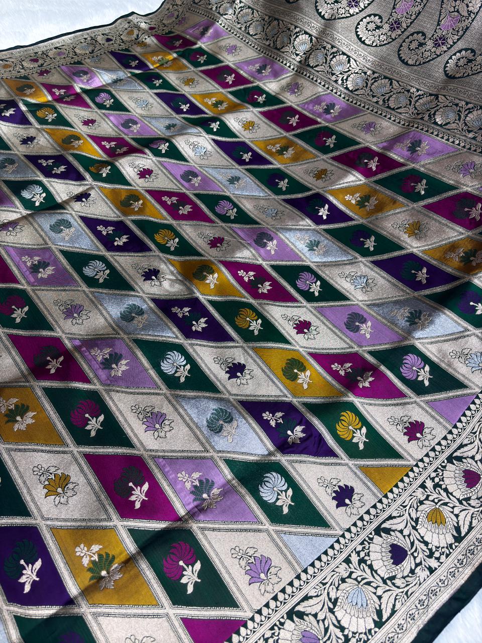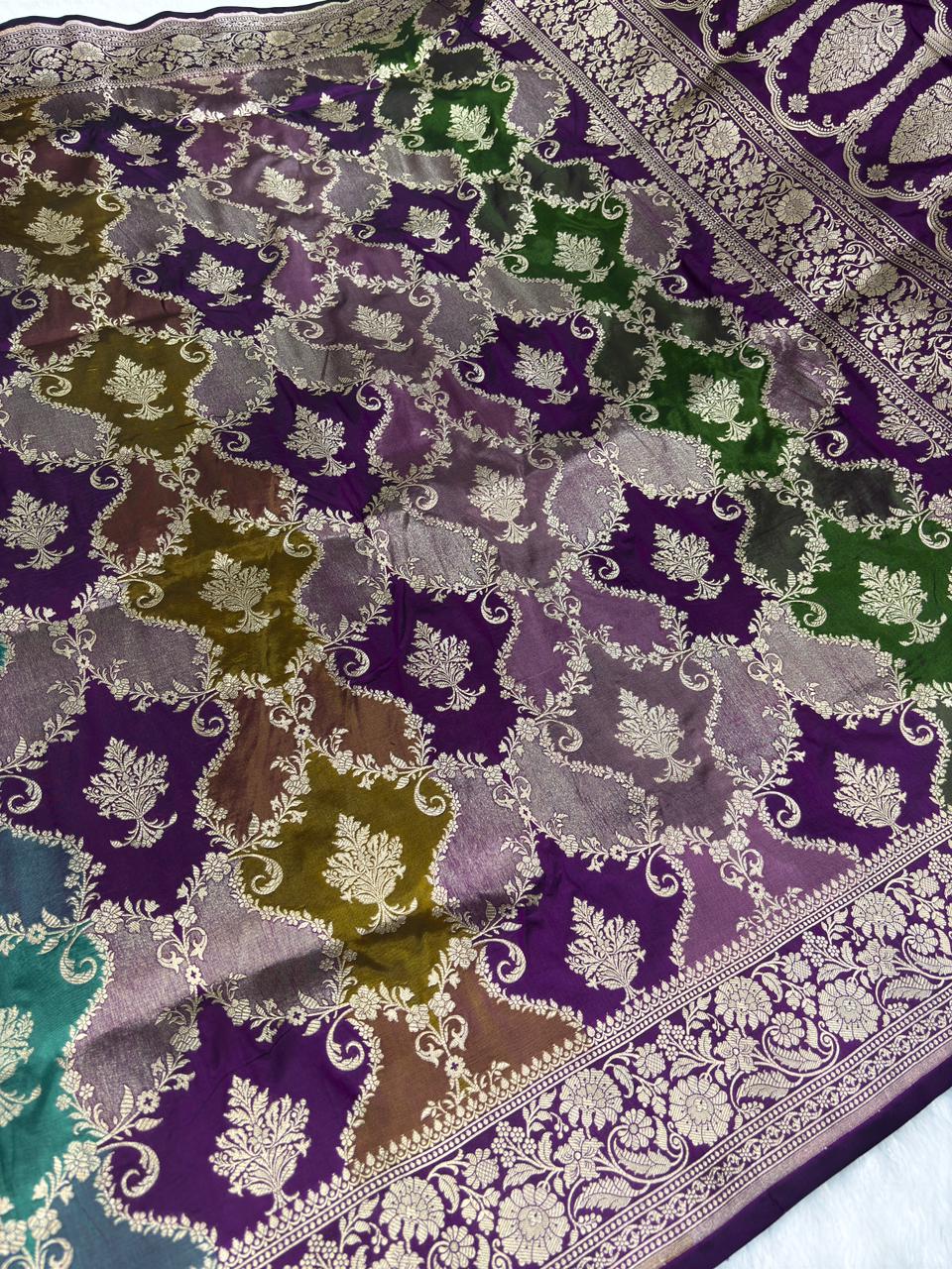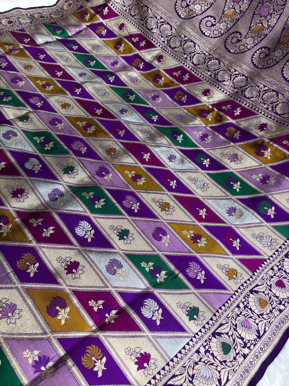 Heritage Purple & Green Rungkaat Katan Silk Saree with Floral Cutwork