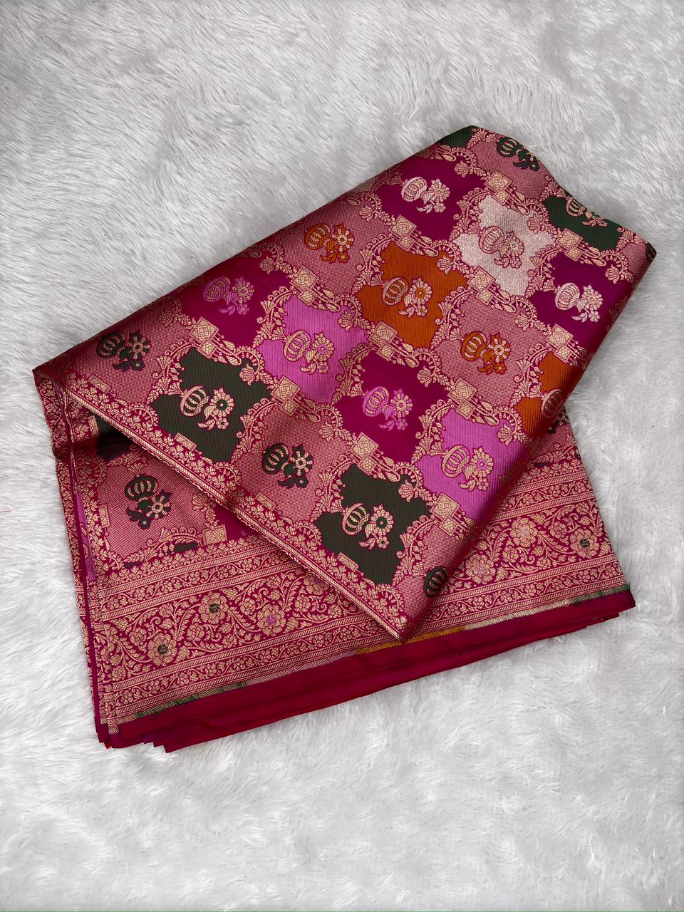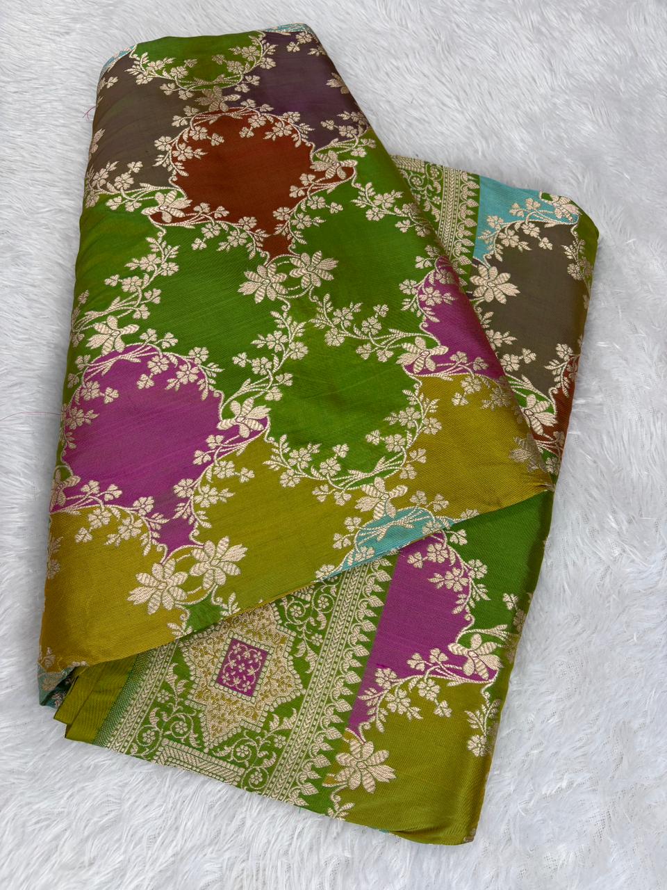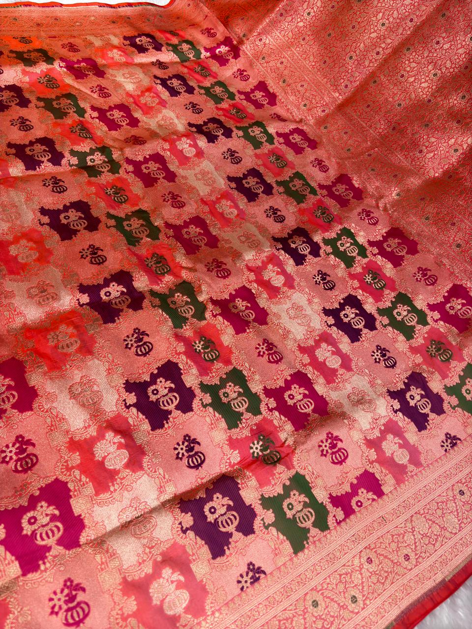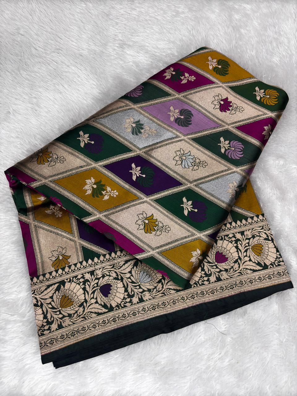 Heritage Purple & Green Rungkaat Katan Silk Saree with Floral Cutwork