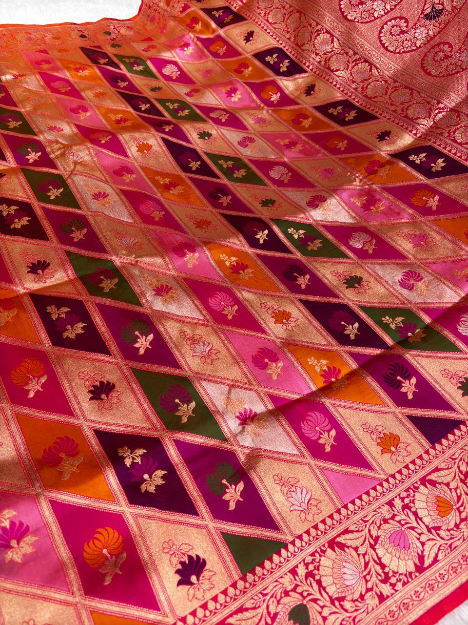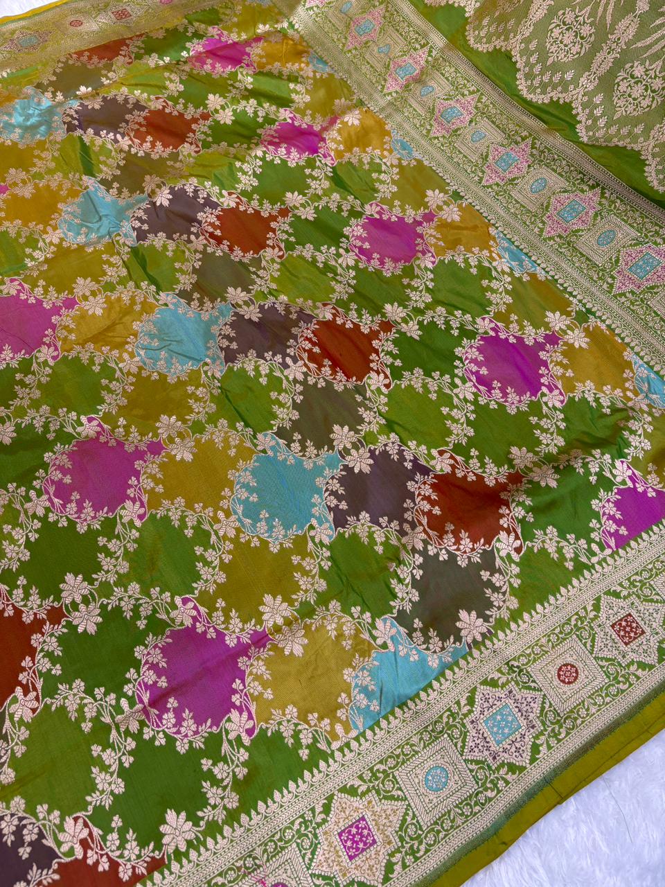 Verdant Green Multi-Color Rangkaat Pure Katan Silk Handloom Saree with Geometric Borders
