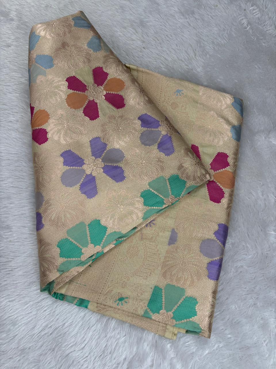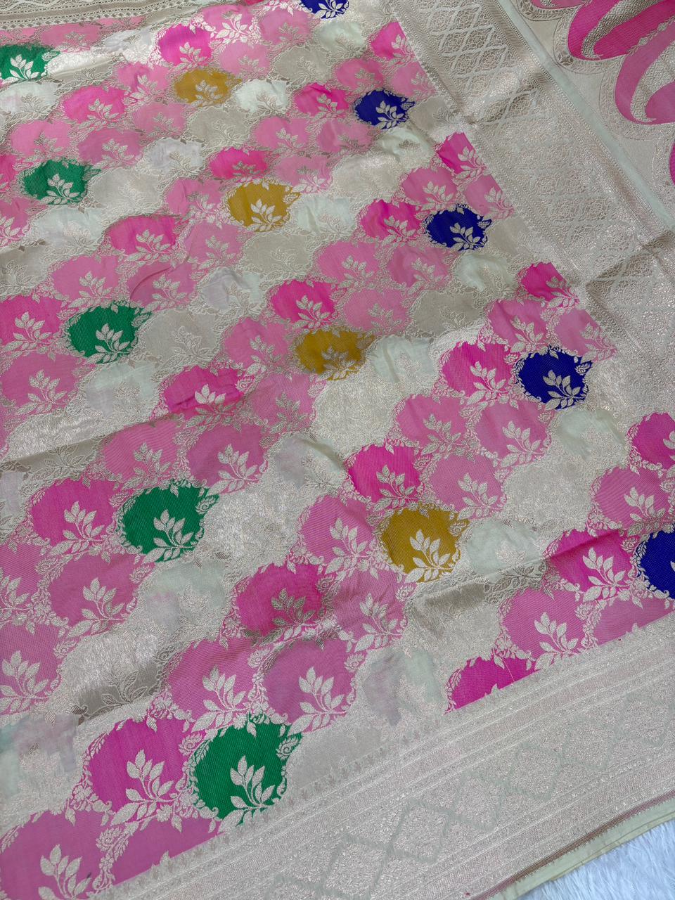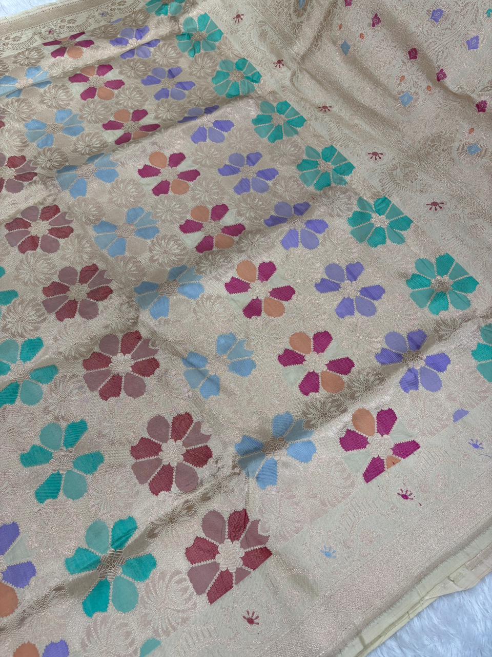 Elegant Cream Pure Katan Rungkaat Cutwork Handloom Saree with Multi-Color Rangkaat Floral Motifs