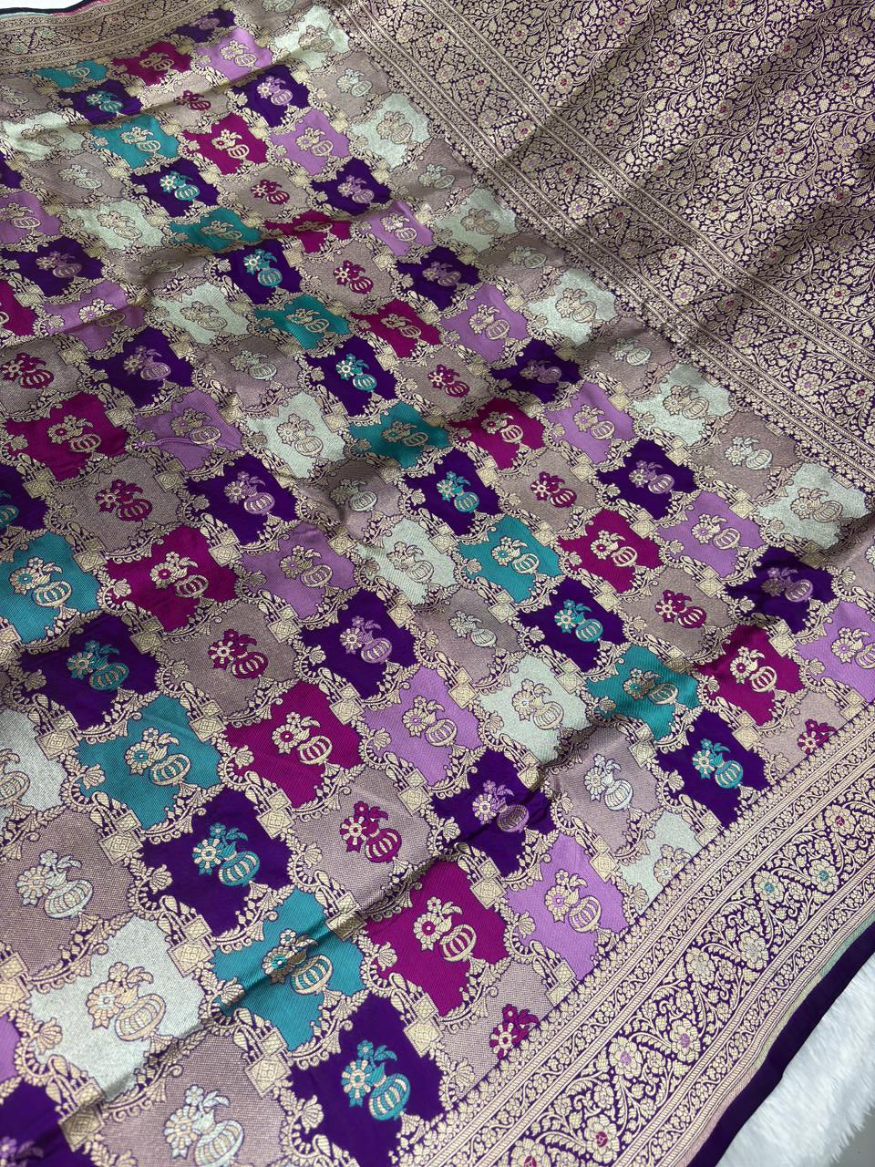 Royal Purple Rungkaat Cutwork Pure Katan Silk Handloom Saree with Geometric Kalash Jaal