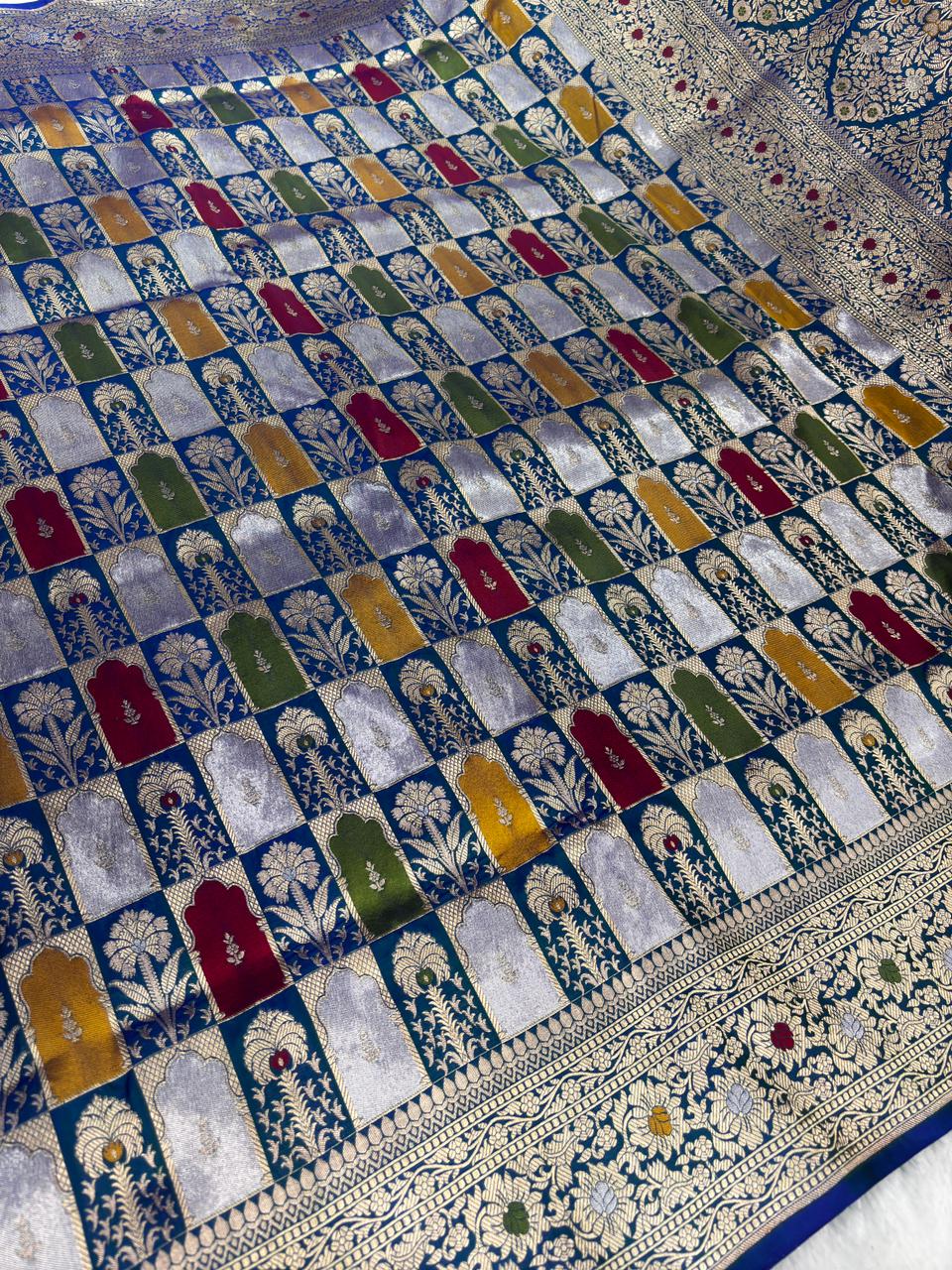 Majestic Royal Blue Rungkaat Katan Silk Saree with Mughal Mehrab Cutwork Jaal