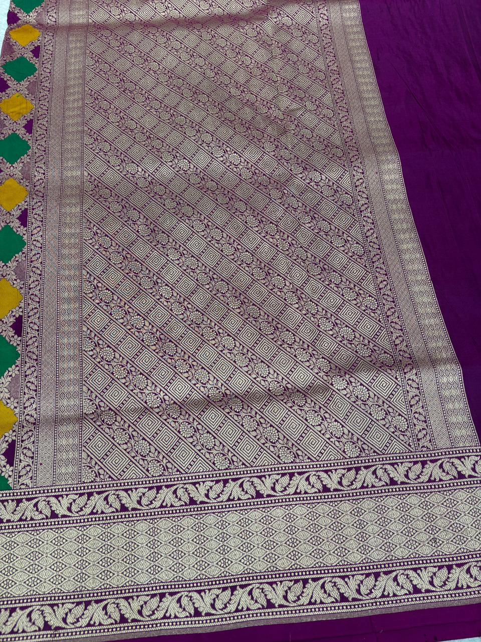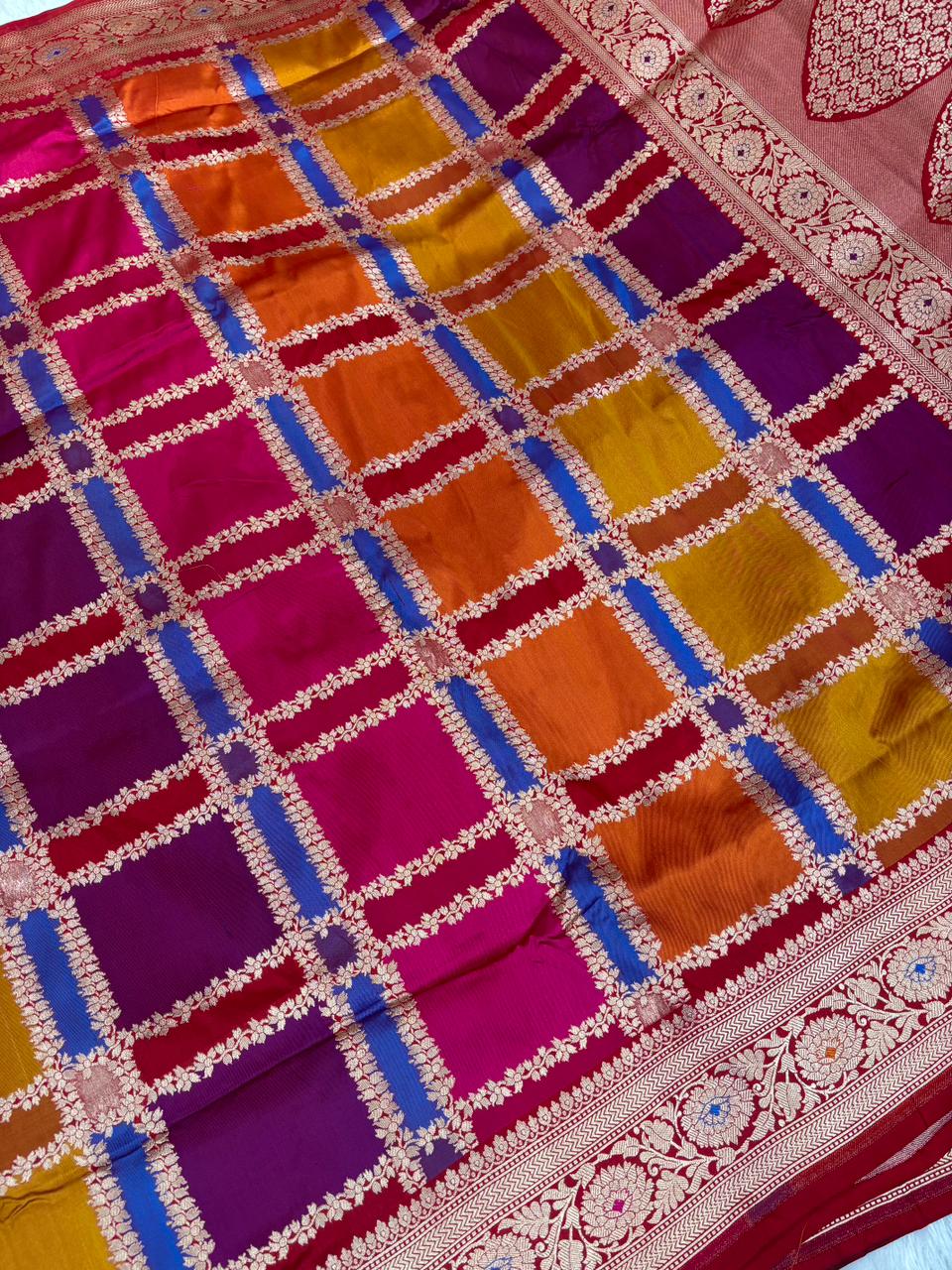 Royal Multi-Color Rangkaat Pure Katan Rungkaat Cutwork Handloom Saree with Star-Floral Lattice