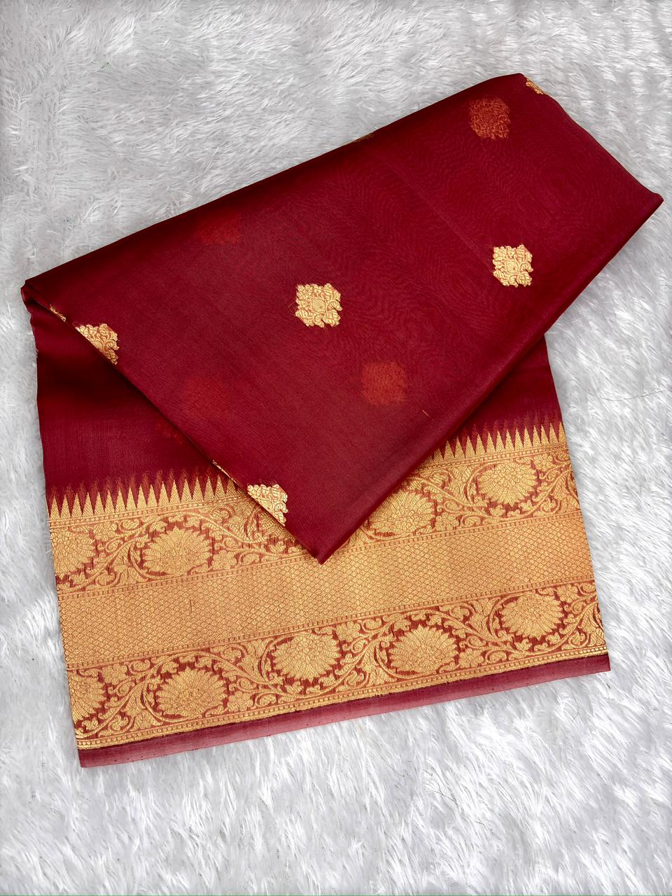 Wine Red Banarasi Kora Silk Designer Kadhua Saree with Temple Border & Floral Zari Work