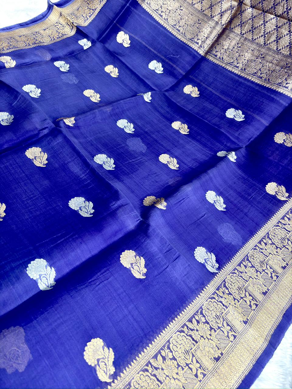 Royal Blue Kora Silk Designer Kadhua Saree - Dual Tone Zari Butta & Brocade Pallu
