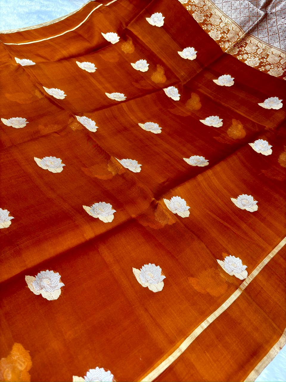 Rust Orange Kora Silk Designer Kadhua Saree - Dual Tone Zari Butta & Striped Blouse