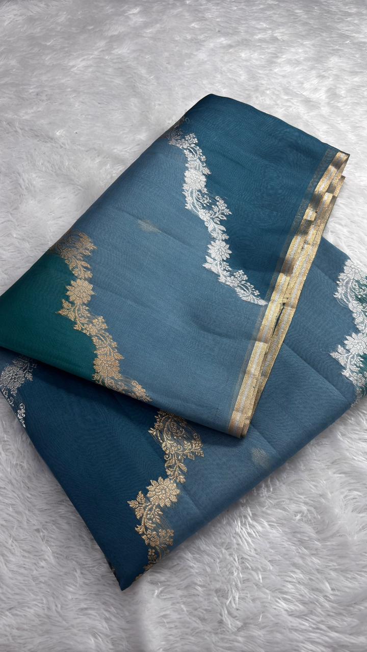 Oceanic Teal & Sea Green Half-and-Half Banarasi Kora Rangkaat Kadhua Saree