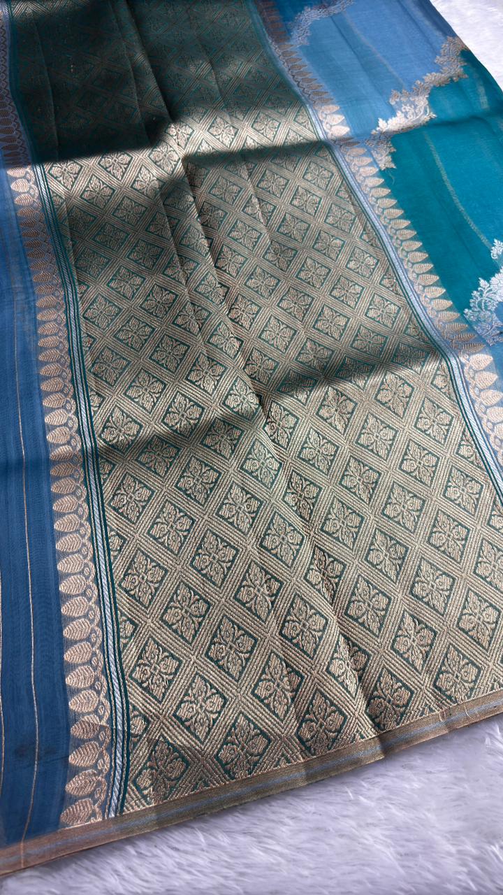 Luxurious Peacock Blue Banarasi Kora Rangkaat Kadhua Saree with Antique Zari Butta