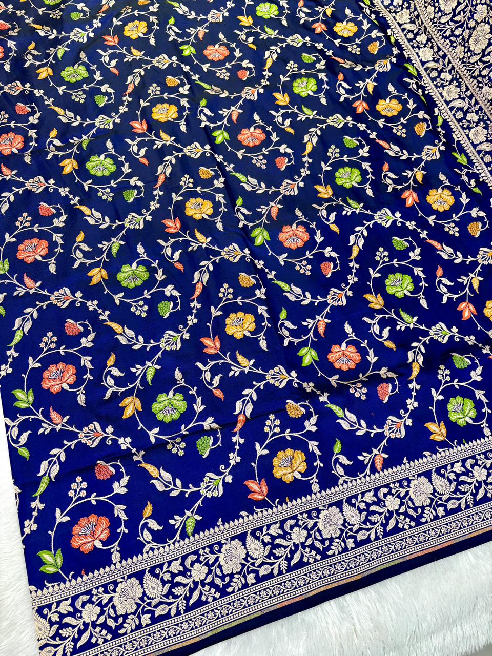 Regal Navy Blue Mashru Silk Banarasi Saree with Vibrant Meenakari Floral Jaal