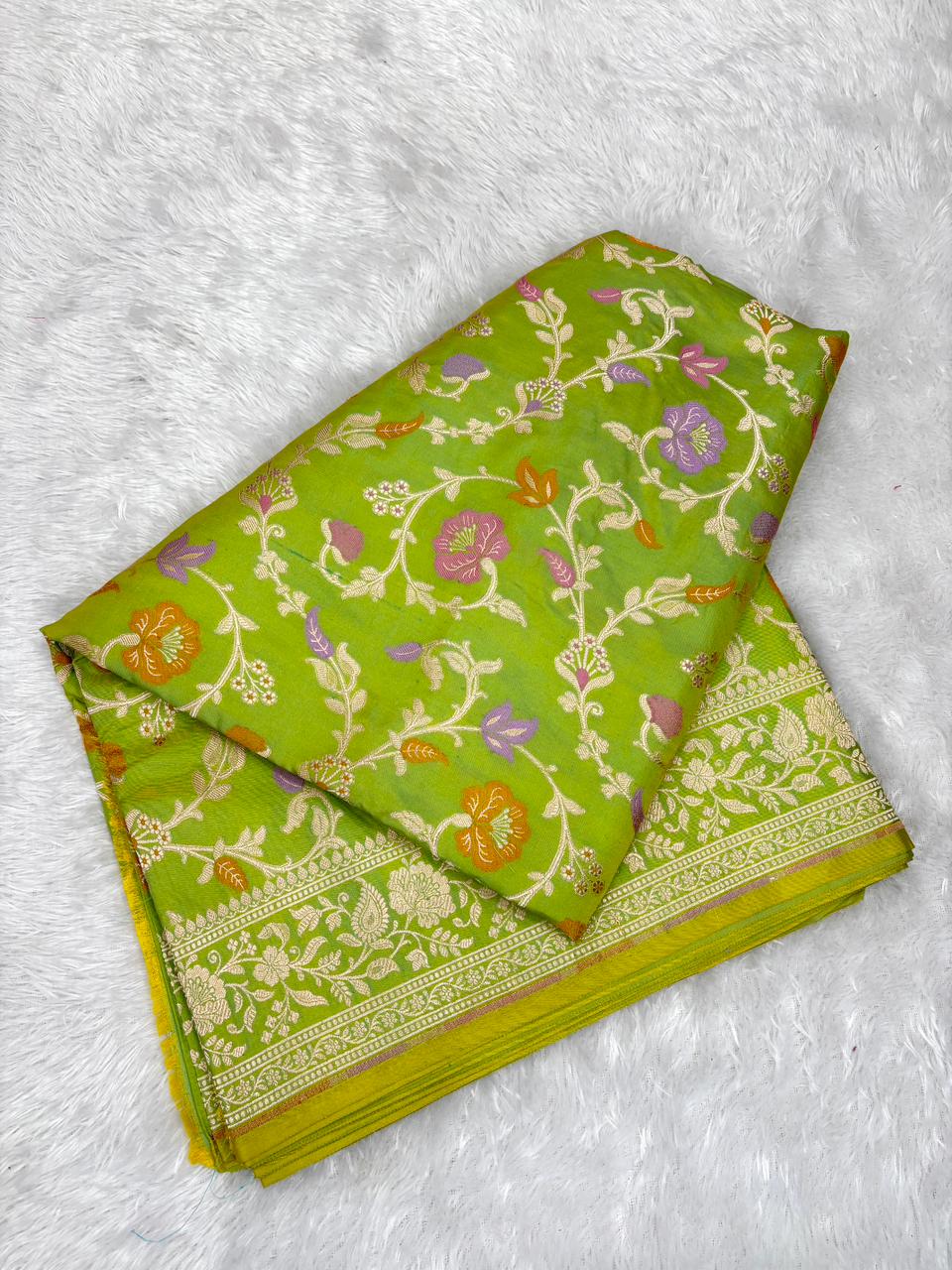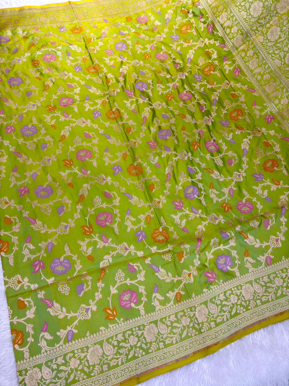Vibrant Parakeet Green Mashru Silk Banarasi Saree with Meenakari Floral Jaal