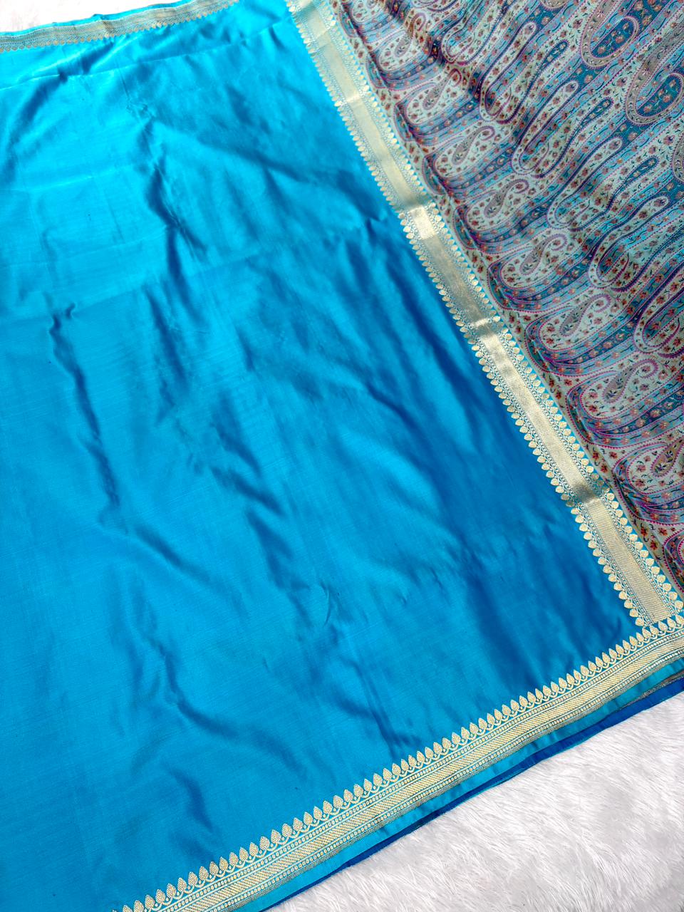 Premium Turquoise Blue Banarasi Mushru Silk Saree with Floral Bel Booti & Paisley Pallu