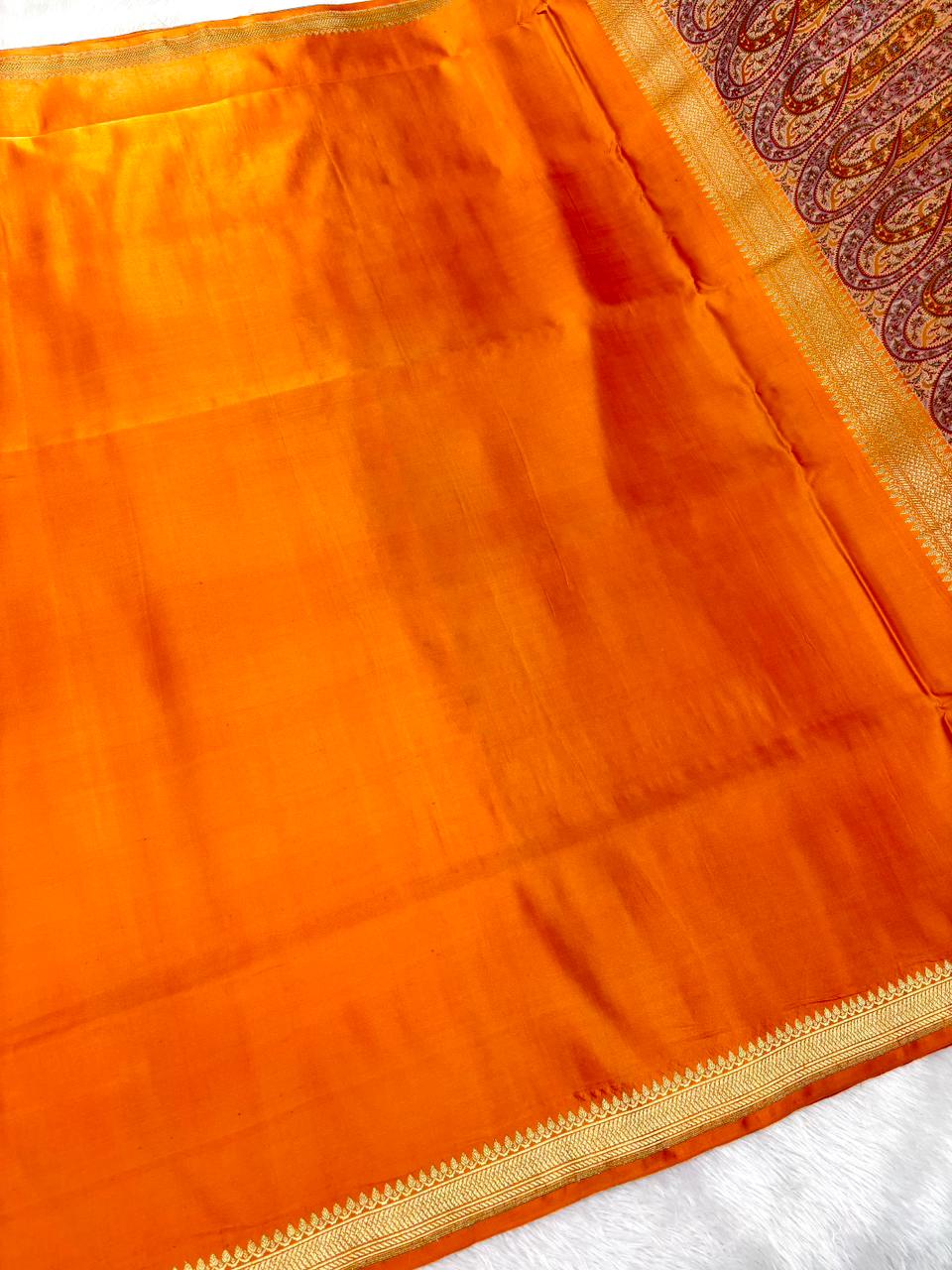 Premium Tangerine Orange Mushru Silk Saree with All-Over Floral Bel Booti & Grand Paisley Pallu