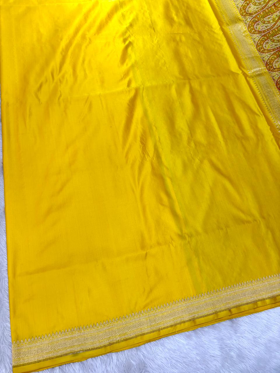 Premium Yellow Banarasi Mushru Silk Saree with Floral Bel Booti and Grand Paisley Pallu.