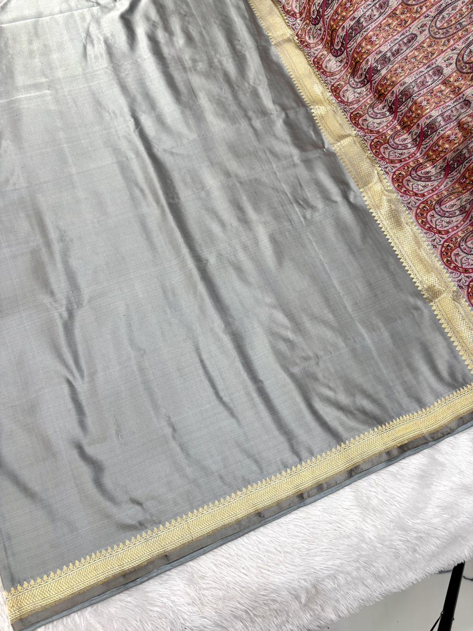 Premium Steel Grey Banarasi Mushru Silk Saree with Floral Bel & Grand Paisley Pallu