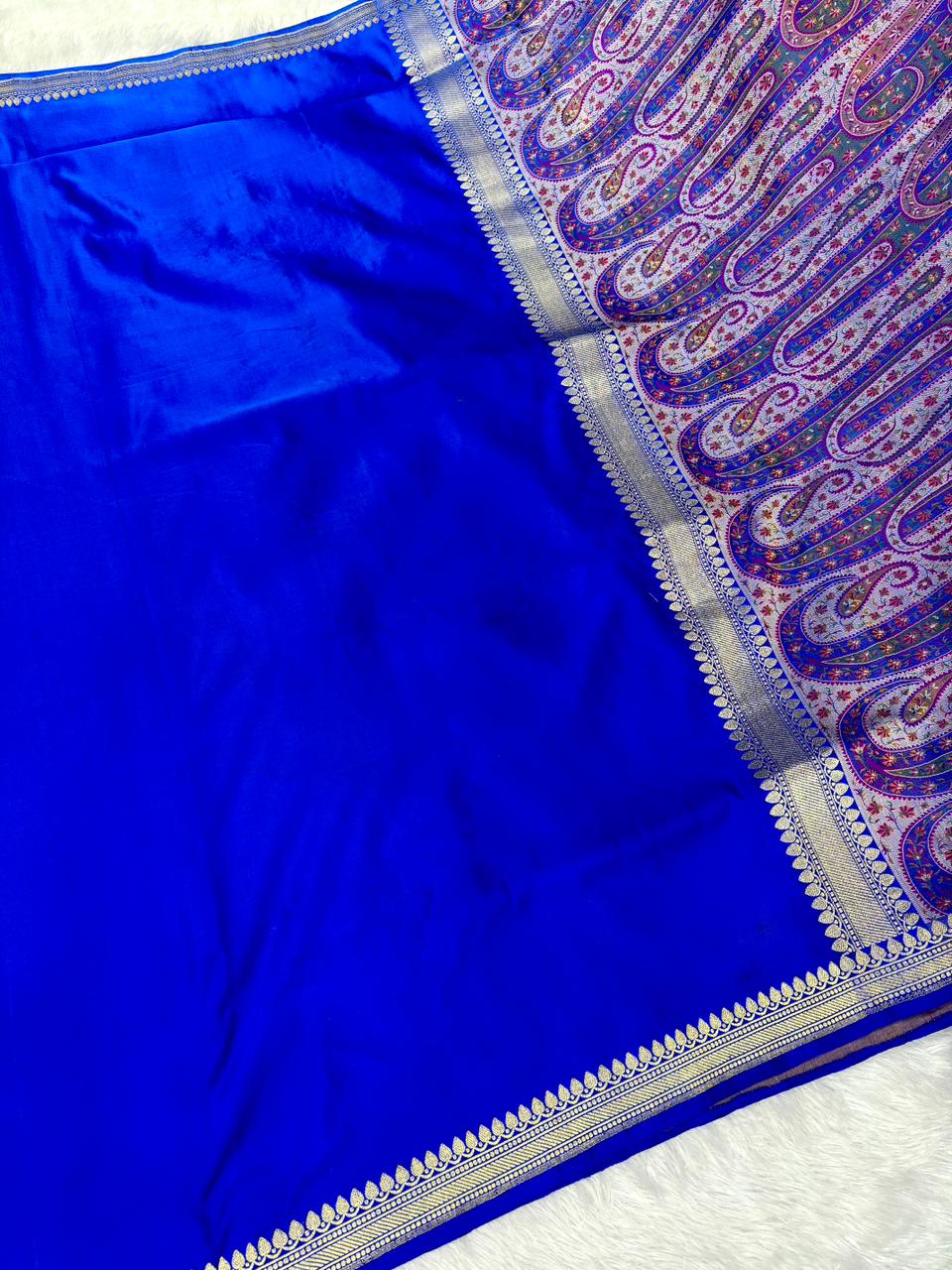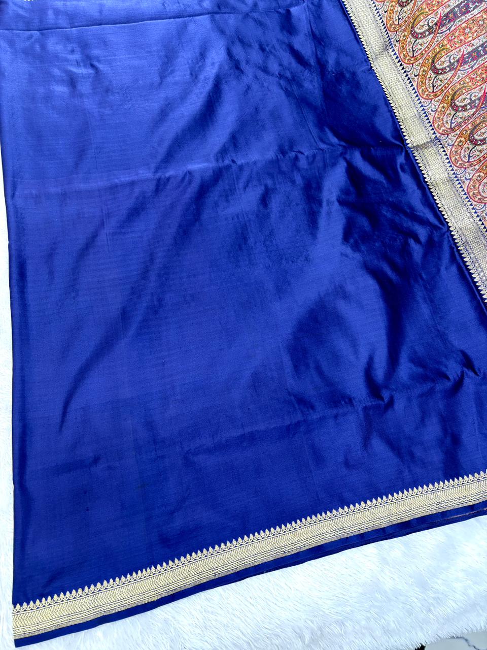 Premium Royal Blue Banarasi Mushru Silk Saree with Floral Bel-Booti & Heritage Paisley Pallu