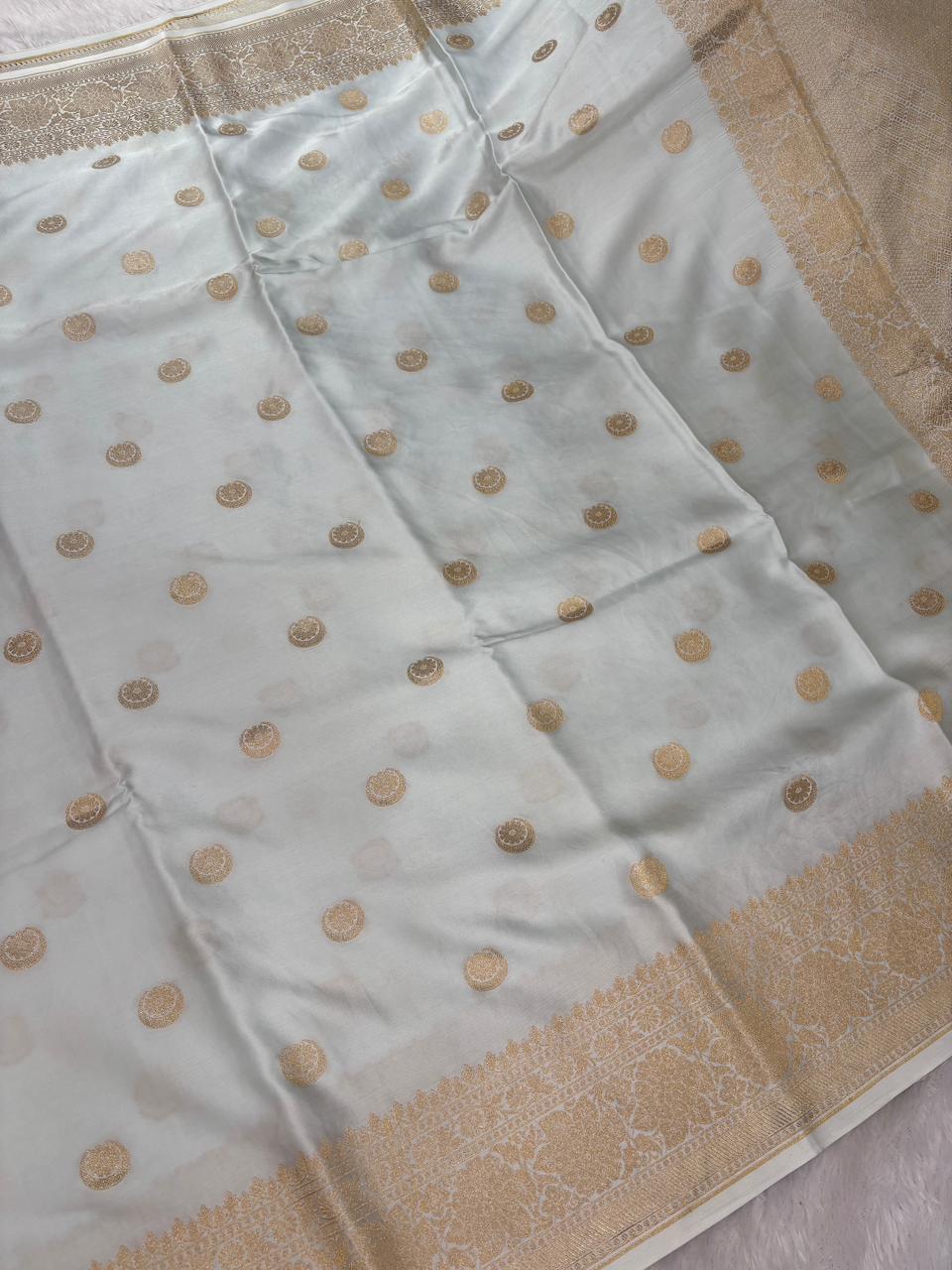 Ice White Banarasi Mashru Silk Saree with Gold Zari