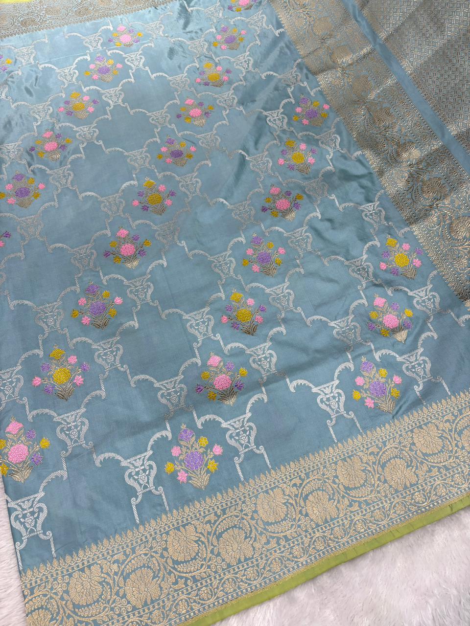 Powdered Blue Pure Katan Silk Banarasi Saree | Handloom Kadhua Meenakari Kalash (Vase) Jaal & Olive Contrast