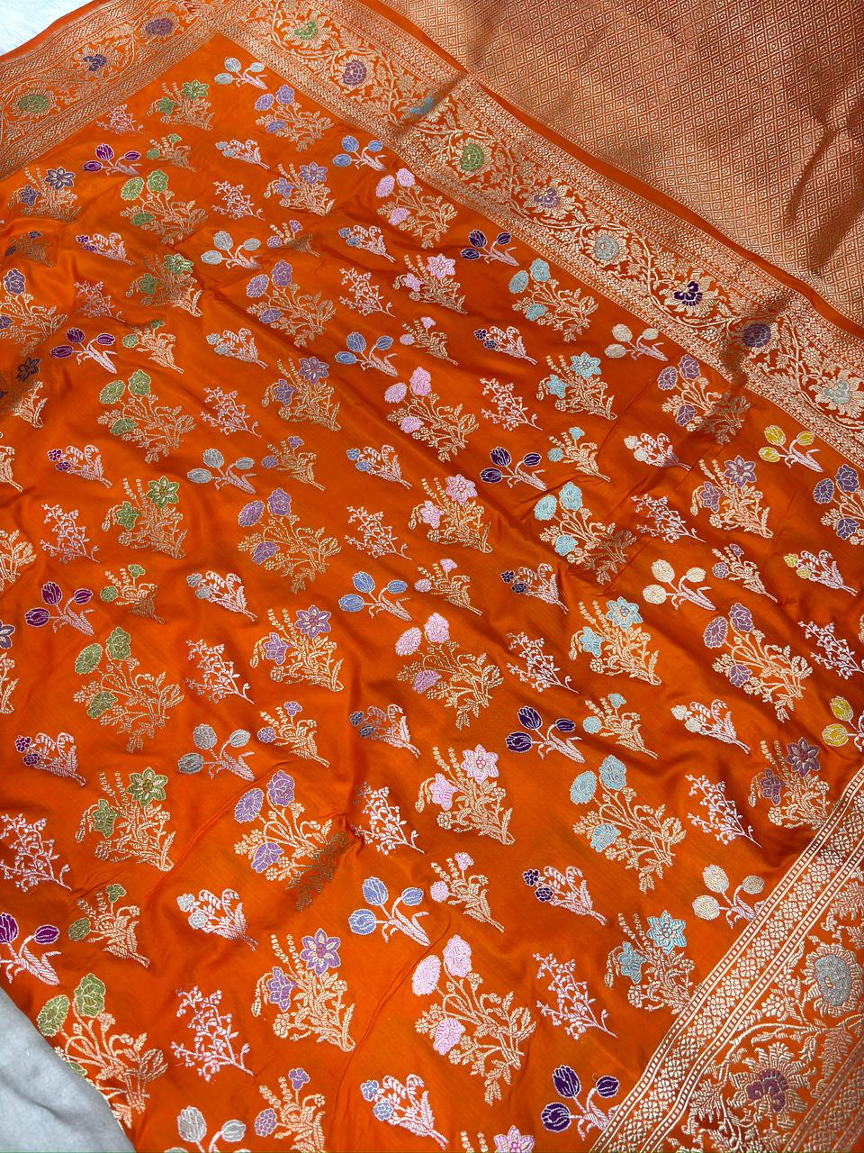 Banarasi Kadhua Jungla Saree in Burnt Orange Katan Silk with Meenakari Florals