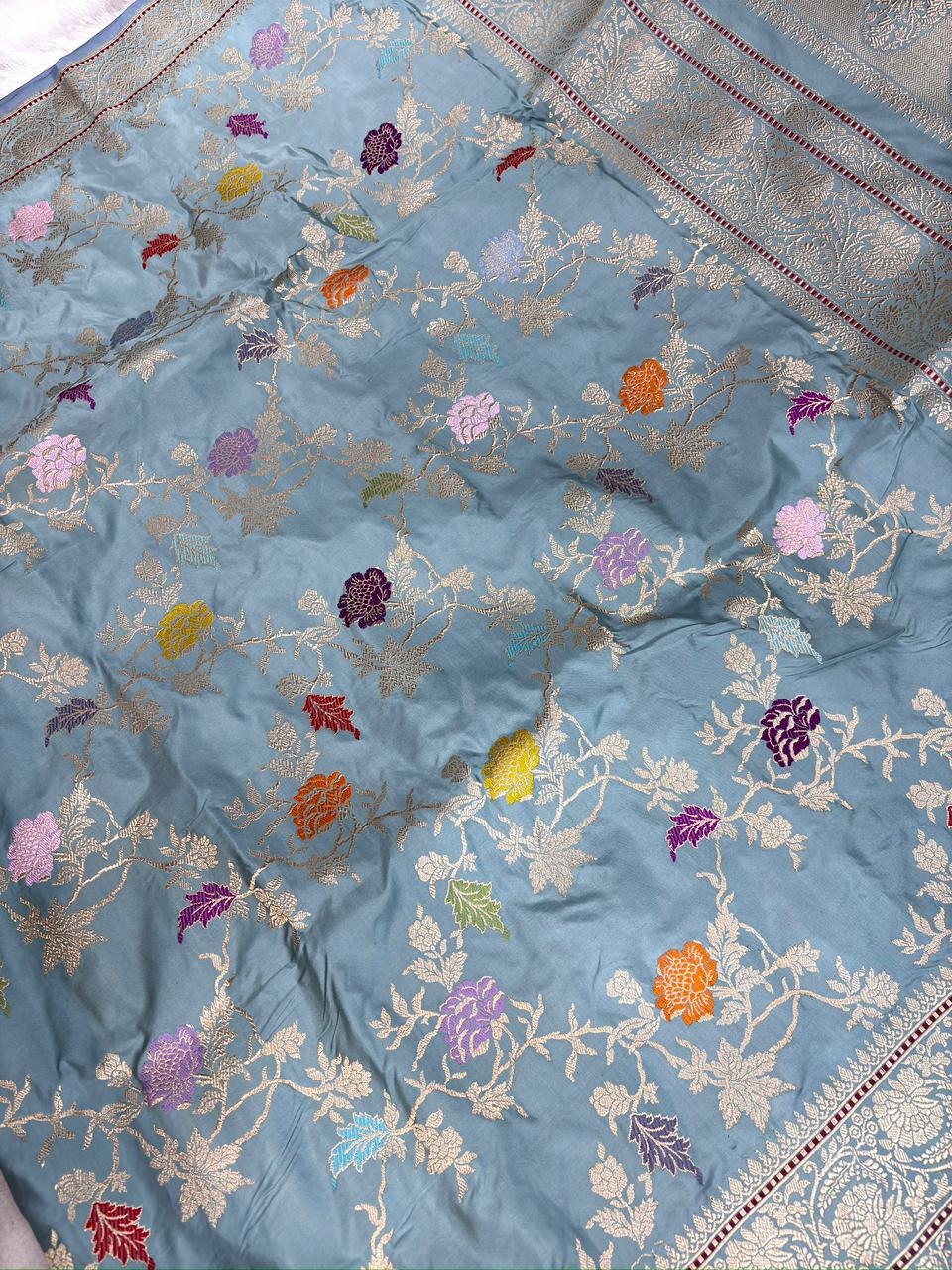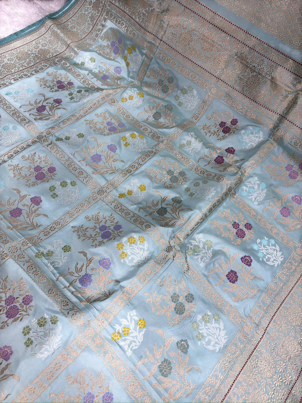Banarasi Kadhua Jungla Saree in Powder Cyan Katan Silk with Pastel Meenakari