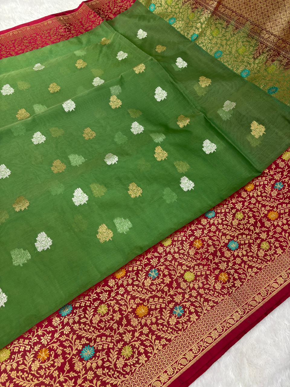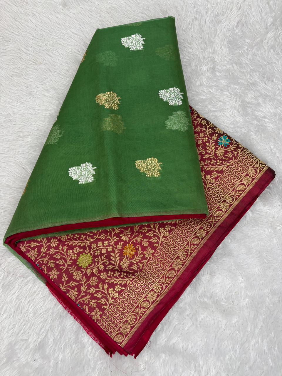 The Ethereal Handloom: Emerald Green & Crimson Kora Kadhua Banarasi