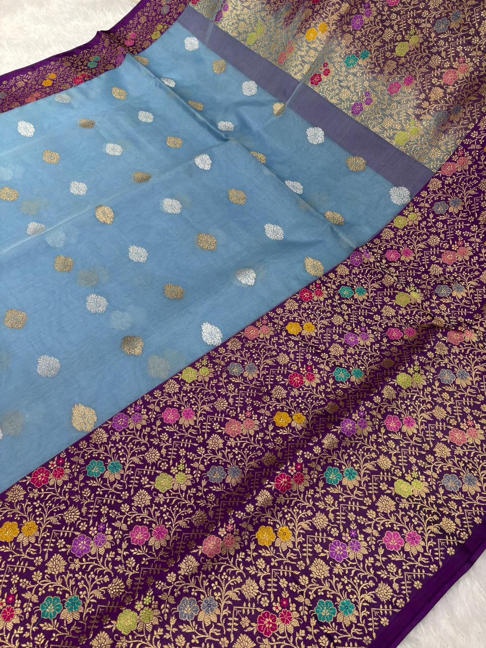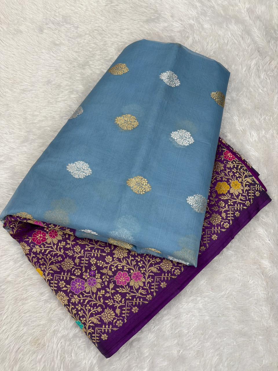 Celestial Elegance: Powder Blue & Royal Violet Kora Kadhua Banarasi Handloom Saree