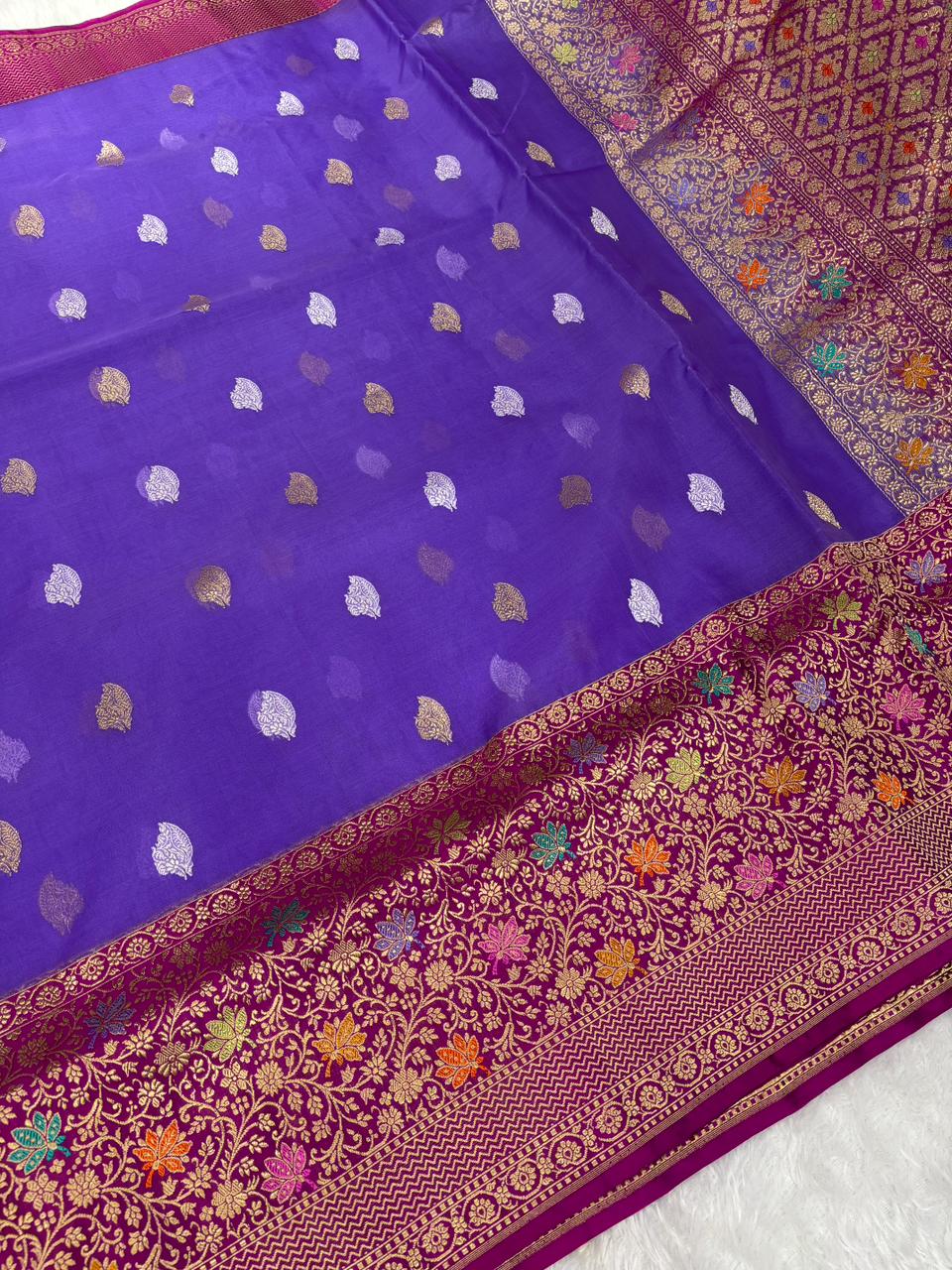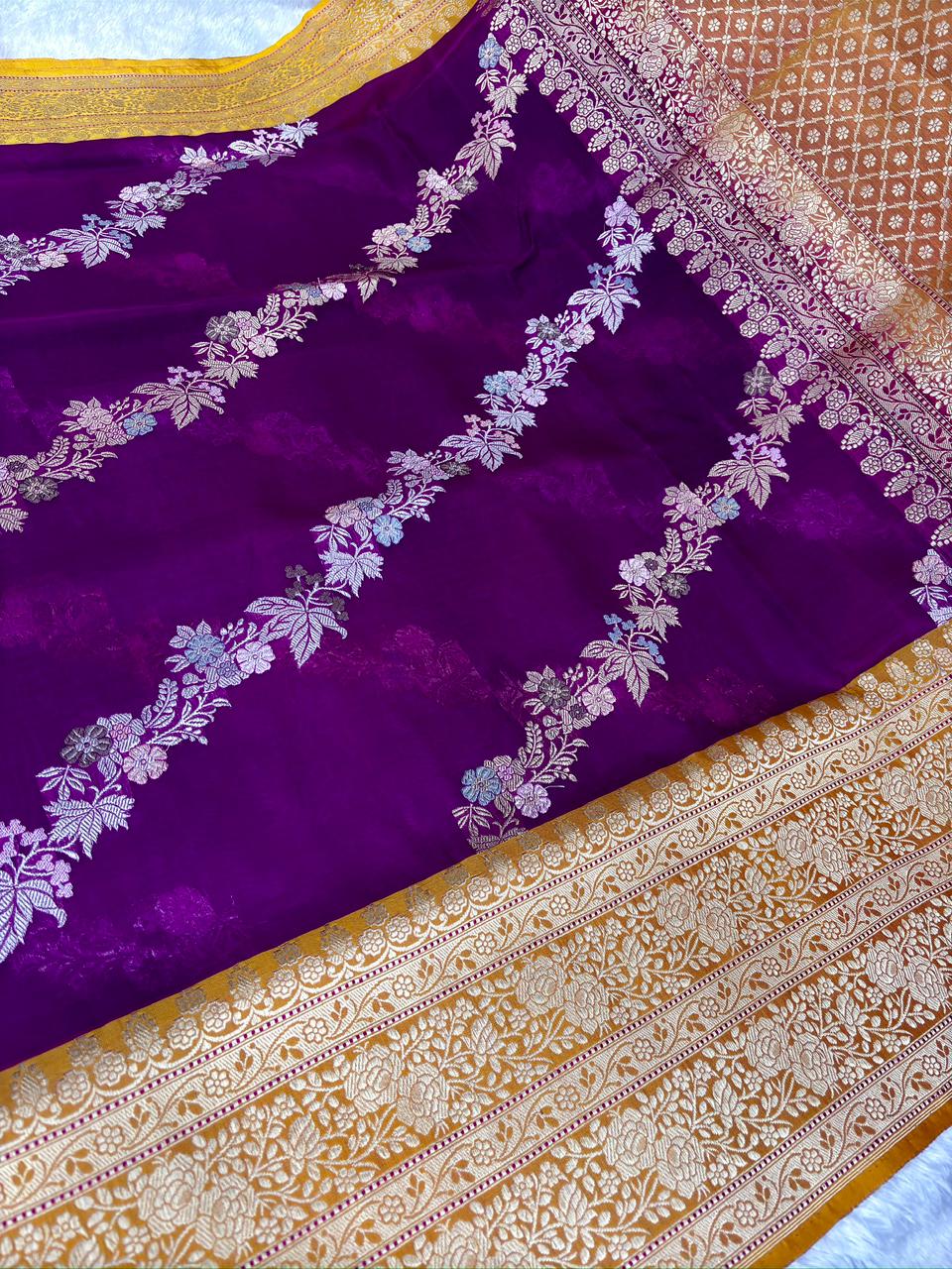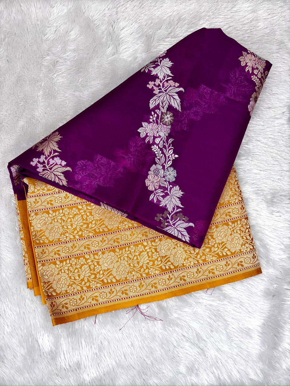 Premium Kora Banarasi Saree in Purple with Contrast Mustard Zari Border and Meena Work