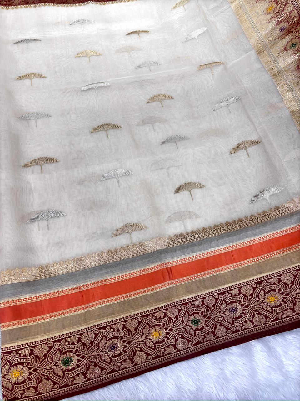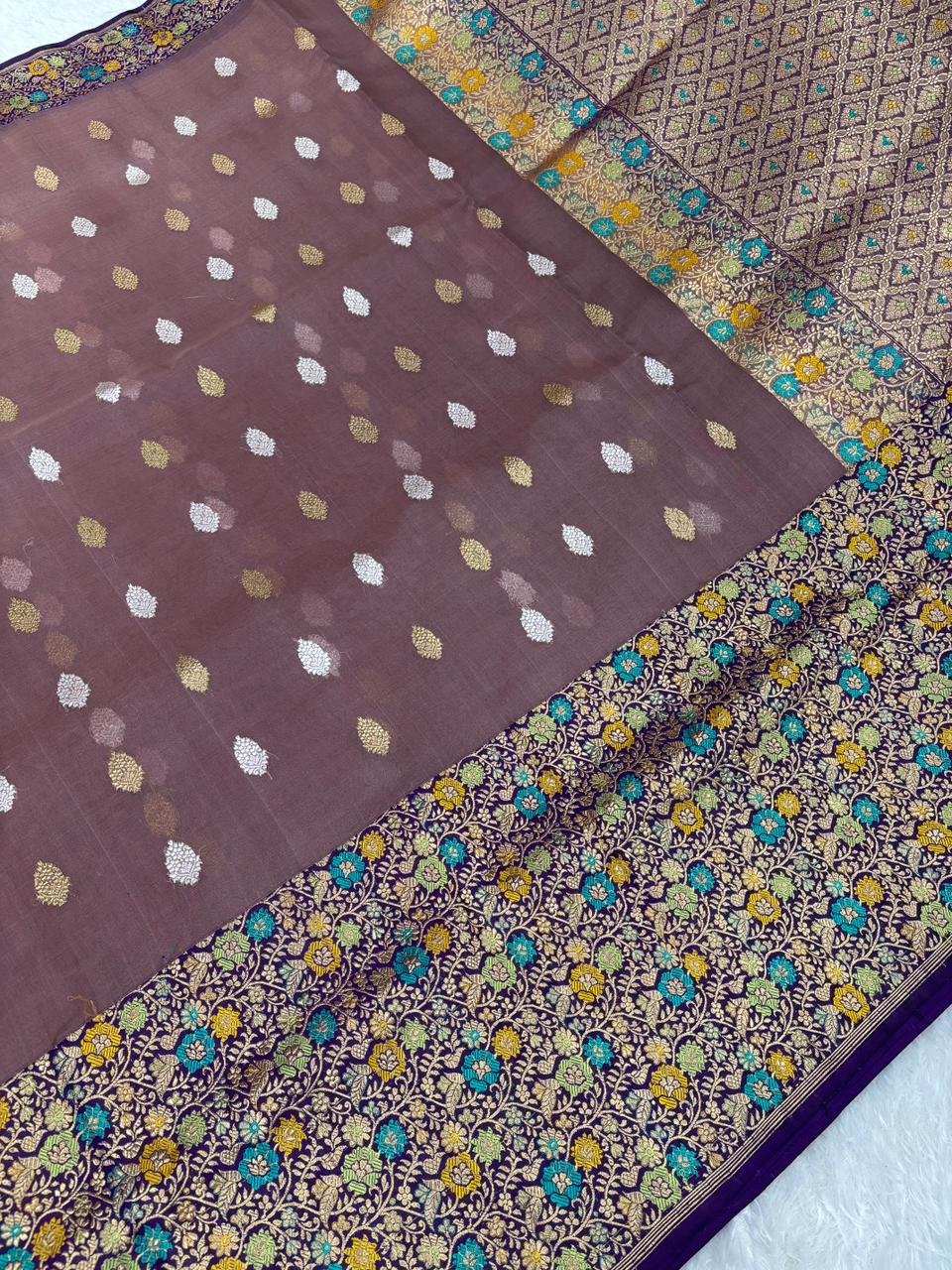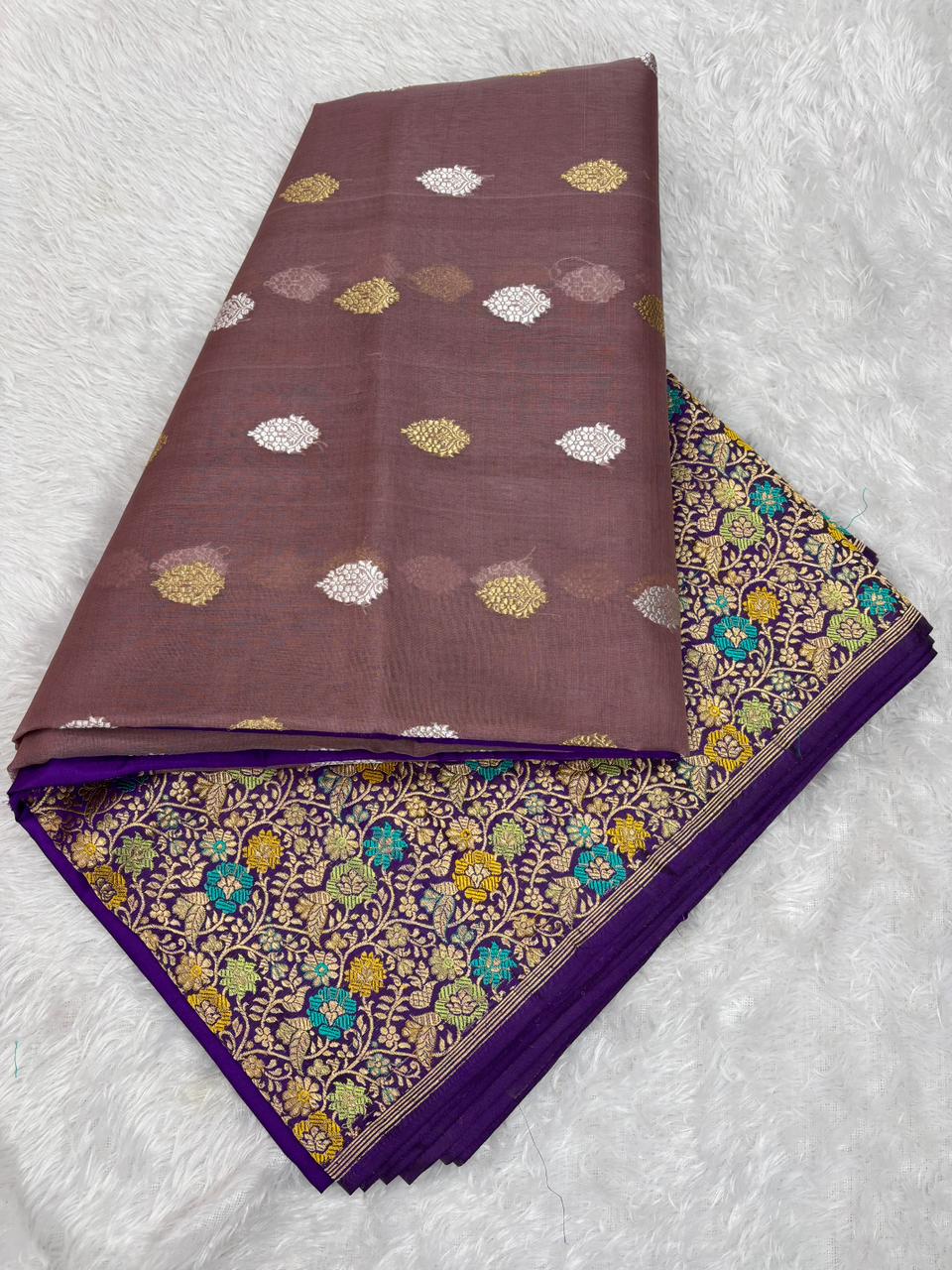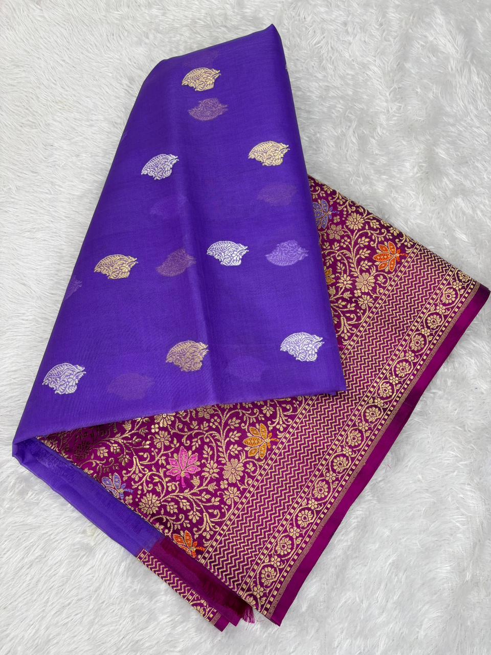 Premium Kora Banarasi Saree in Purple with Contrast Mustard Zari Border and Meena Work