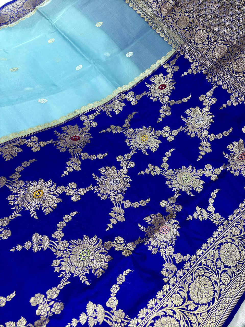 Premium Royal Blue & Sky Blue Dual-Tone Premium Kora Saree with Antique Zari Kadhua Weave