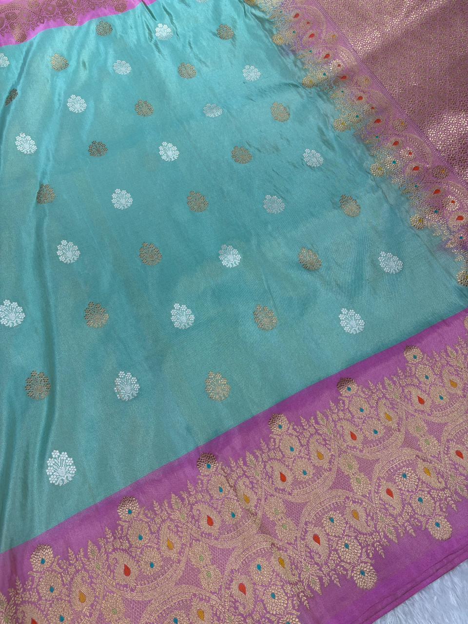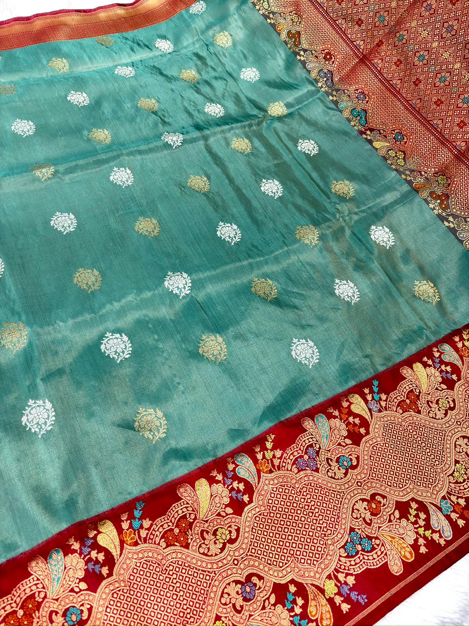 Premium Seafoam Green Tissue Silk Handloom Banarasi Saree with Crimson Kadhua Meenakari Border