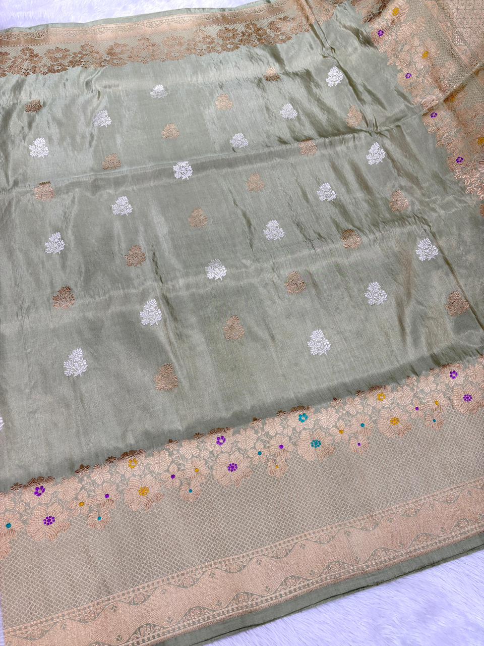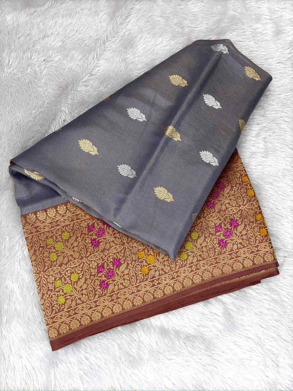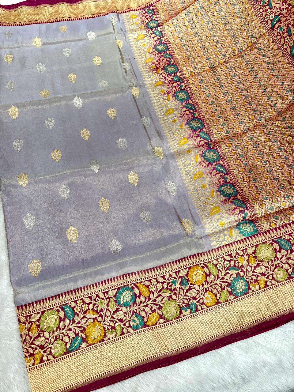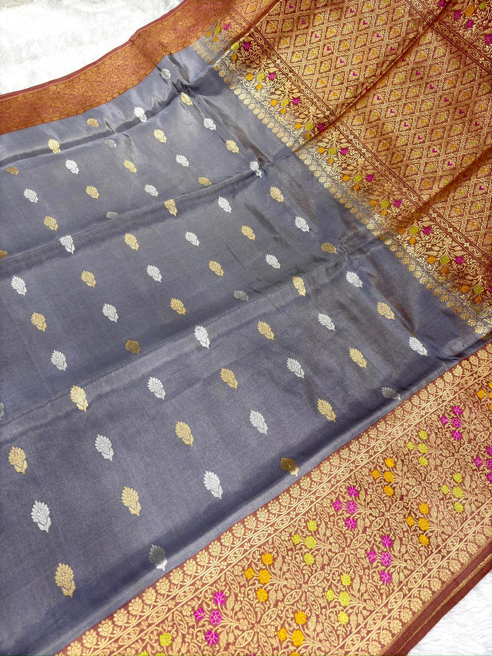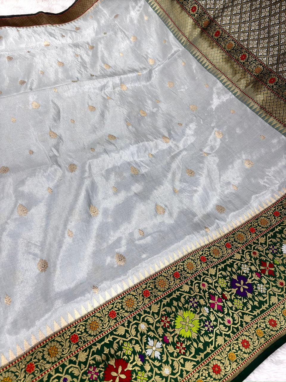 Premium Silver-Grey Tissue Silk Handloom Banarasi Saree with Meenakari Kadhwa Border