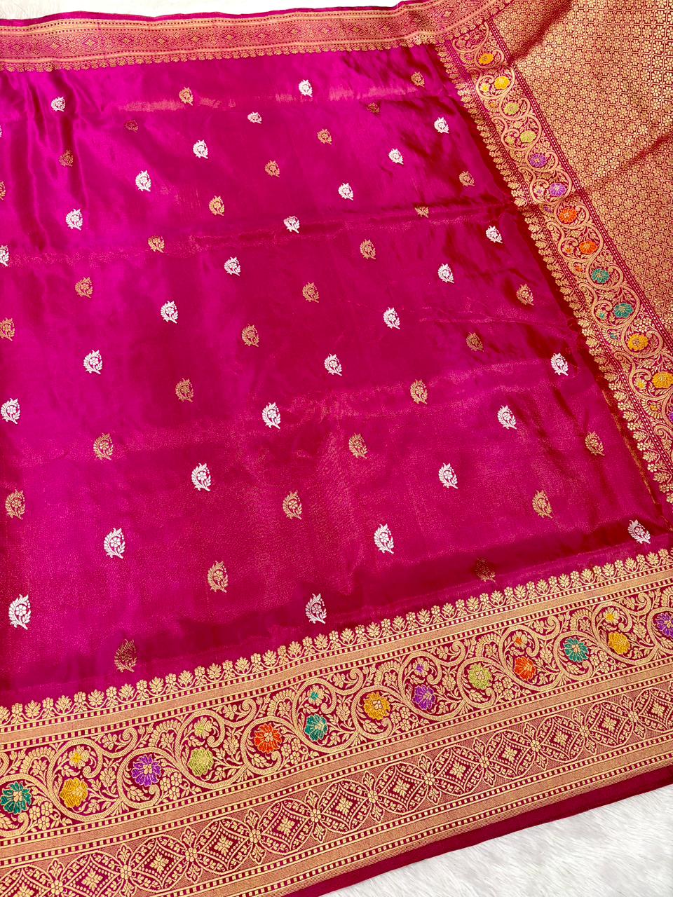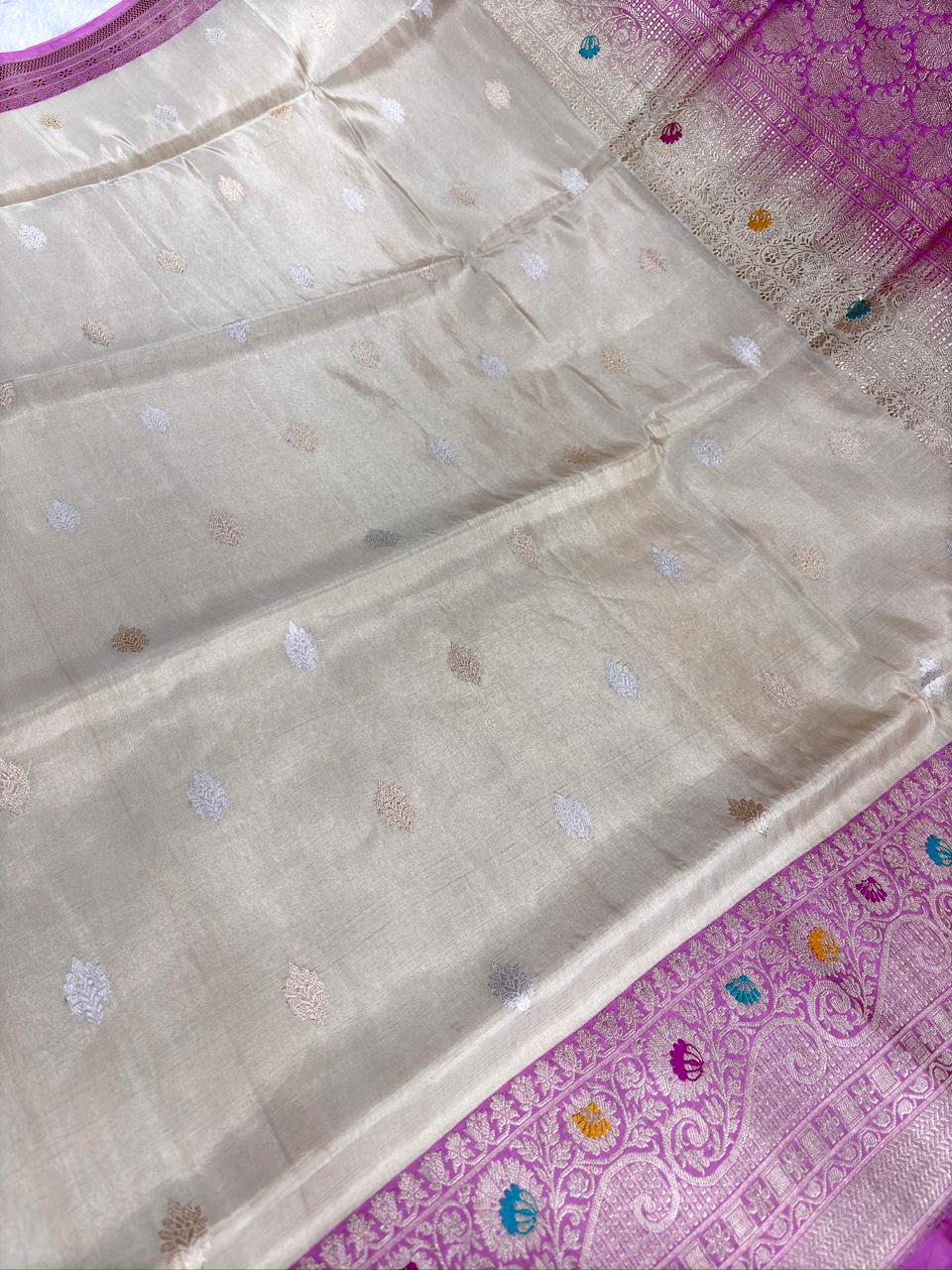 Premium Ivory Tissue Silk Banarasi Saree with Rani Pink Kadhua Meenakari Border & Sona-Rupa Buti