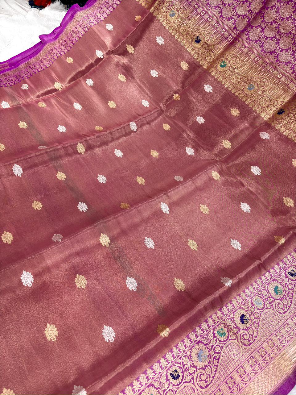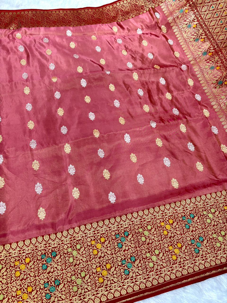 Silver-Grey Tissue Silk Banarasi Saree with Copper-Pink Kadhua Meenakari Border & Sona-Rupa Buti