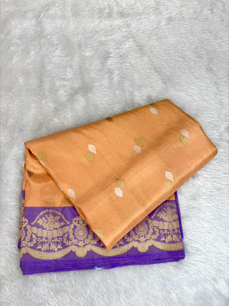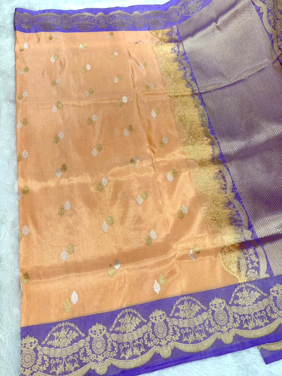 Exquisite Peach Tissue Kadhua Saree with Contrast Purple Scalloped Border