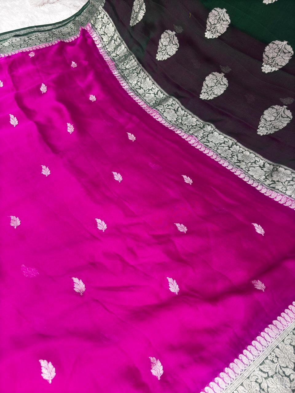Pure Khaddi Chiffon Banarasi Saree in Magenta & Bottle Green with Silver Zari