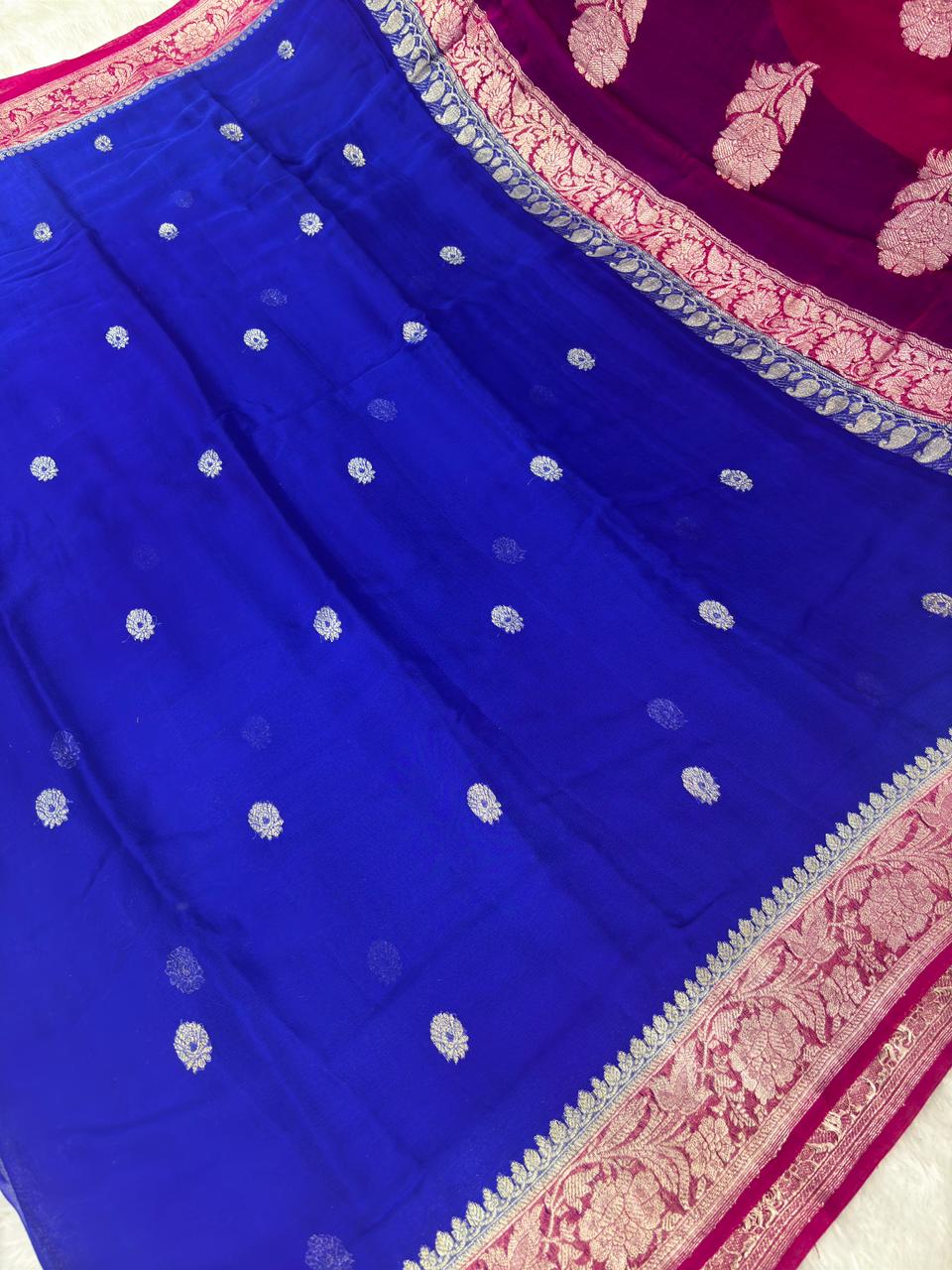 Royal Blue & Rani Pink Pure Khaddi Chiffon Banarasi Saree with Silver Zari