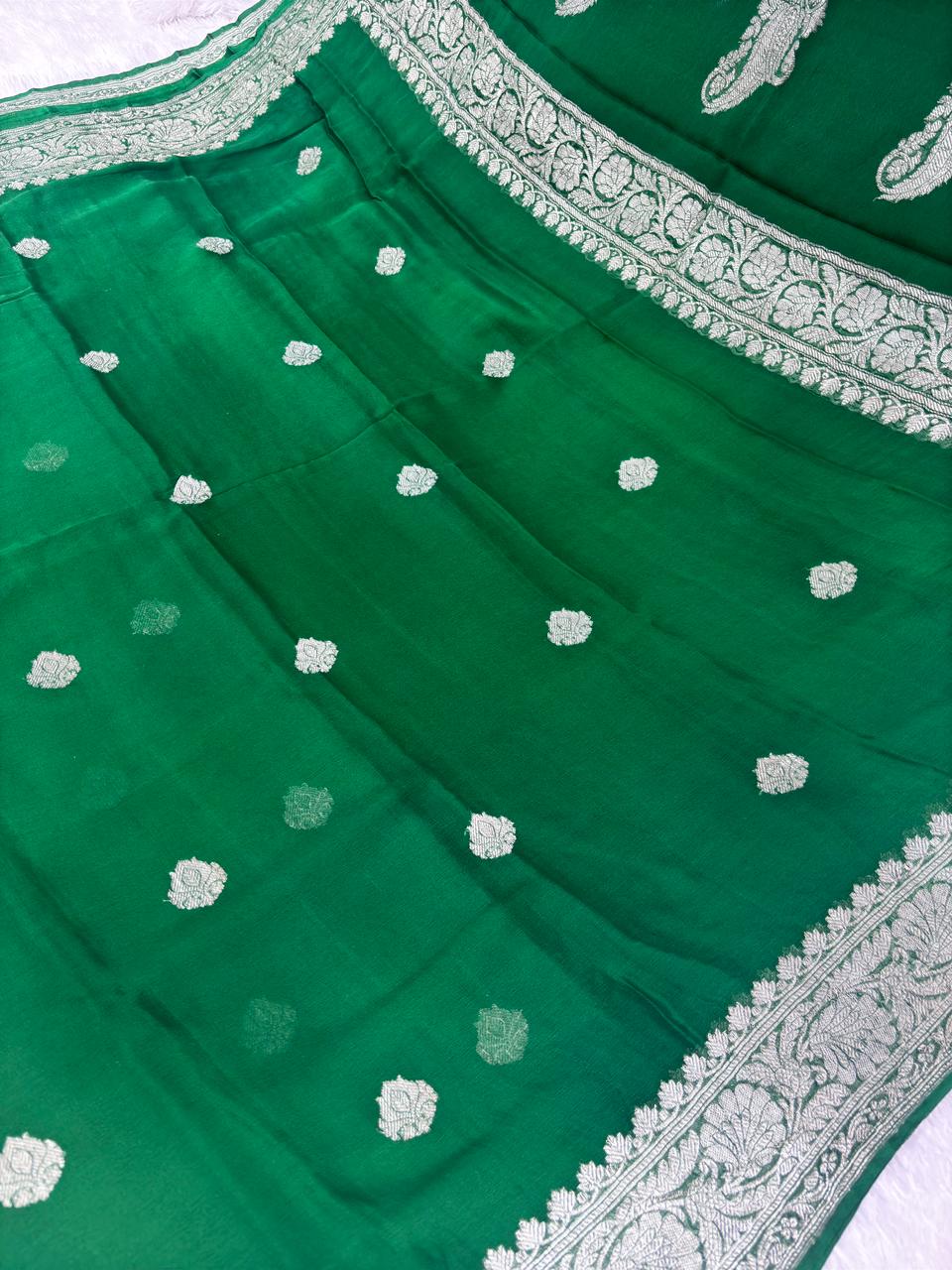 The Emerald Enchantress: Pure Khaddi Chiffon Banarasi Saree
