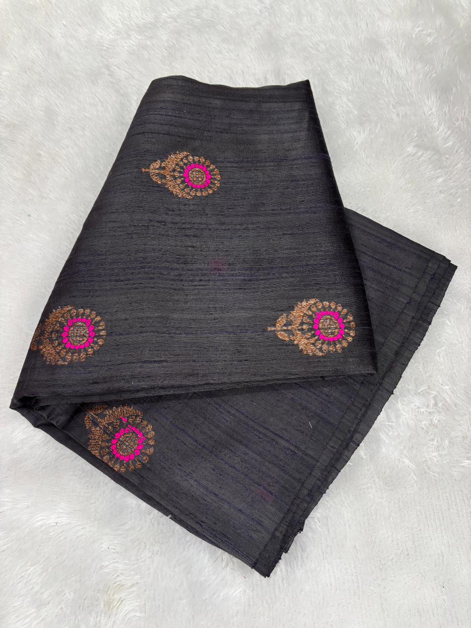Sophisticated Midnight Black Raw Silk Tussar Handloom Saree with Pink Meenakari