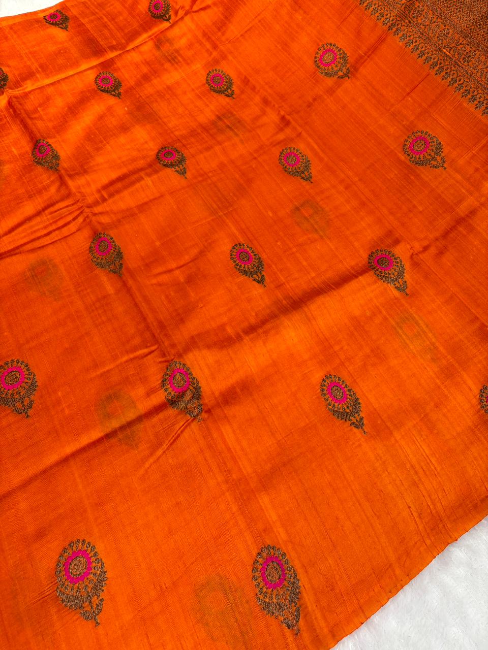 Radiant Sunset Orange Raw Silk Tussar Saree with Pink Meenakari Buta