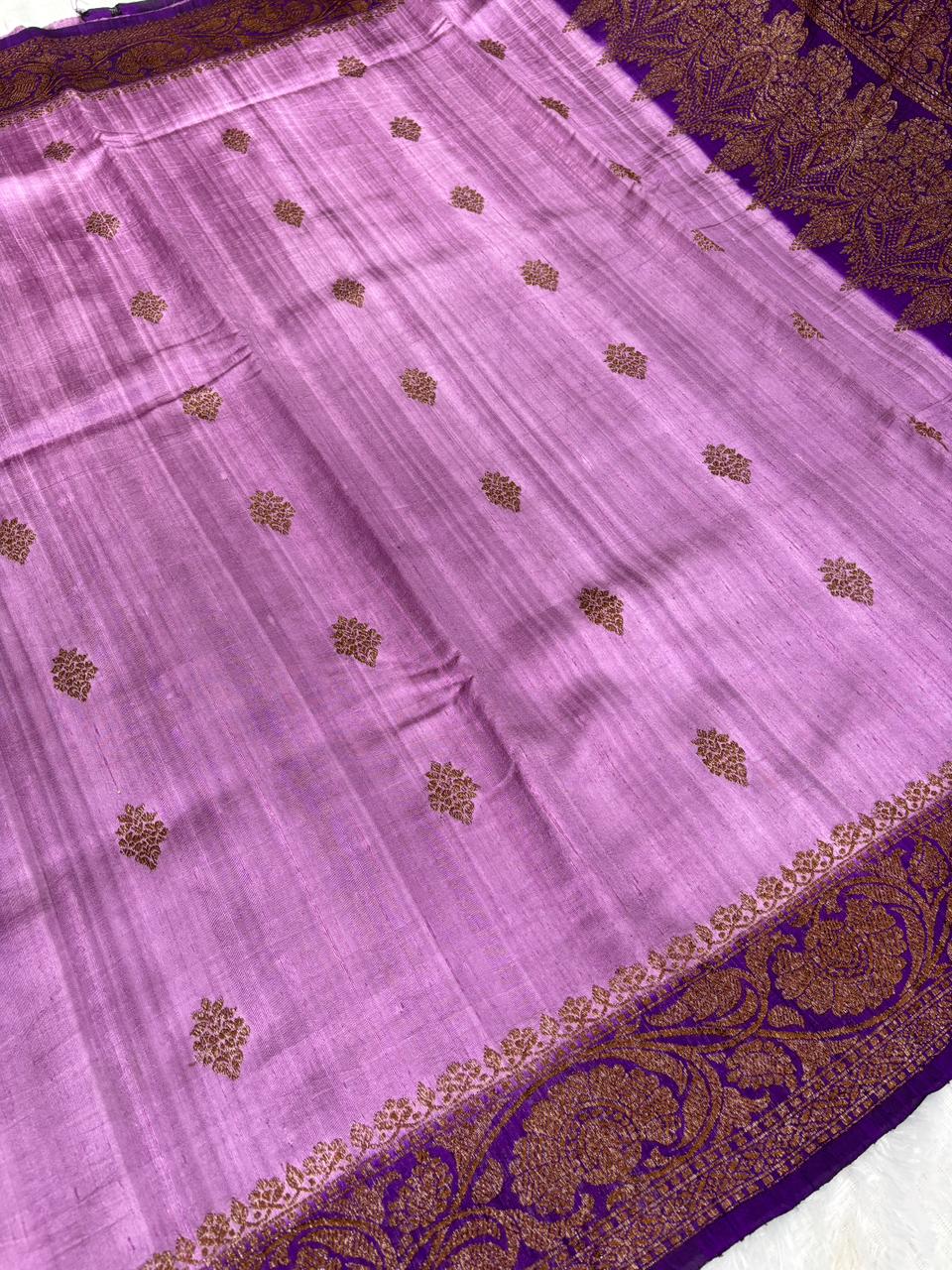 Antique Gold Zari Lilac & Magenta Raw Silk Tussar Saree